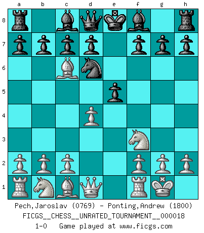 Last move : 1-0 2011 August 20 16:19:26 [Event "FICGS__CHESS__UNRATED_TOURNAMENT__000018"] [Site "FICGS"] [Date "2011.07.06"] [Round "1"] [White "Pech,Jaroslav"] [Black "Ponting,Andrew"] [Result "1-0"] [WhiteElo "0769"] [BlackElo "1800"] 1.e4 e5 2.Nf3 Nc6 3.Bb5 Nf6 4.O-O Nxe4 5.d4 Nd6 6.Bxc6 1-0 Ruy Lopez : Berlin defense, Open variation Kingside Castling by player White (move 4) Player White won this chess game. Follow this game move after move (download)Spassky will not be psyched out by Fischer. (Mike Goodall) Wenn ich Weiß habe gewinne ich weil ich Weiß habe, wenn ich Schwarz habe gewinne ich weil ich Bogoljubov bin. (Efim Bogoljubov) El Ajedrez es de 30 a 40 por ciento psicología. Uno no cuenta con esto cuando se juega contra una computadora. No lo puedo confundir. (Judith Polgar) On entre au jeu d'Echecs comme on entre en Religion. Pour le joueur d'Echecs, la partie d'Echecs c'est l'office, la messe, le défilé du 1er Mai, le dépôt de gerbe au Monument aux Morts. C'est un drame sacré. (Michel Roos) Memory is a complicated thing, a relative to truth, but not its twin. (Barbara Kingsolver, Animal Dreams)