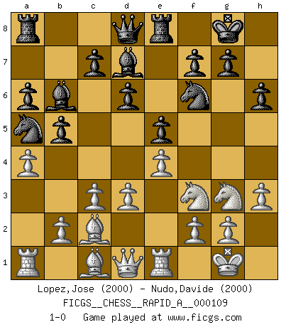 Last move : 1-0 2011 September 21 22:38:4 [Event "FICGS__CHESS__RAPID_A__000109"] [Site "FICGS"] [Date "2011.07.06"] [Round "1"] [White "Lopez,Jose"] [Black "Nudo,Davide"] [Result "1-0"] [WhiteElo "2000"] [BlackElo "2000"] 1.e4 e5 2.Nf3 Nc6 3.Bc4 Bc5 4.c3 Nf6 5.d3 O-O 6.Nbd2 a6 7.Bb3 b5 8.O-O d6 9.h3 Bd7 10.Re1 Bb6 11.Nf1 Na5 12.Bc2 h6 13.Ng3 Re8 14.a4 1-0 This chess game has been lost on time (started : 2011.07.06 17:8:33) Giuoco Piano Kingside Castling by player Black (move 5) Kingside Castling by player White (move 8) Player White won this chess game. Follow this game move after move (download)The game of chess is the touchstone of the intellect. (Goethe) Man kann eine Schachpartie nur gewinnen, wenn das Gleichgewicht gestört ist. In einer Stellung mit ungestörtem Gleichgewicht ist auch das größte Genie hilflos - in der Stellung steckt dann eben kein genialer Einfall. (Wilhelm Steinitz) A la fecha, Fischer esta simplemente un nivel arriba de todos los mejores jugadores de Ajedrez del mundo. (John Jacobs) Tous ces prétendus hommes politiques sont les pions, les Cavaliers, les Tours ou les Fous d'une partie d'échecs qui se jouera tant qu'un hasard ne renversera pas l'échiquier. (Honoré de Balzac) Locking firmely the window serves nothing, only small thiefs pass through there, the big thiefs enter through the front door. (Luc-Olivier Leclerc)