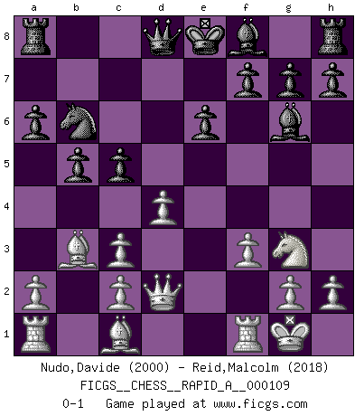 Last move : 0-1 2011 September 22 22:43:22 [Event "FICGS__CHESS__RAPID_A__000109"] [Site "FICGS"] [Date "2011.07.06"] [Round "1"] [White "Nudo,Davide"] [Black "Reid,Malcolm"] [Result "0-1"] [WhiteElo "2000"] [BlackElo "2018"] 1.e4 d5 2.exd5 Nf6 3.d4 Bg4 4.Bb5+ Nbd7 5.f3 Bf5 6.Nc3 a6 7.Ba4 b5 8.Bb3 Nb6 9.Nge2 Nfxd5 10.Ng3 Nxc3 11.bxc3 Bg6 12.O-O e6 13.Qd2 c5 0-1 This chess game has been lost on time (started : 2011.07.06 17:8:33) Scandinavian defense Kingside Castling by player White (move 12) Player Black won this chess game. Follow this game move after move (download)Chess is imagination. (David Bronstein) Lisa Lane, amerikanische Schachmeisterin, hatte Fischer einmal als stärksten lebenden Spieler bezeichnet. Antwort: Das ist richtig, aber Lisa Lane ist eigentlich nicht in der Lage, das zu beurteilen. (Robert James Fischer) El Ajedrez es un terrible juego. Si no controlas el centro, tu oponente tiene una posición mas holgada. Si tienes control del centro, ¡entonces realmente tu tienes algo de que preocuparte!. (Siegbert Tarrasch) Aidez vos pièces, elles vous aideront. (Paul Morphy) However beautiful the strategy, you should occasionally look at the results. (Winston Churchill)
