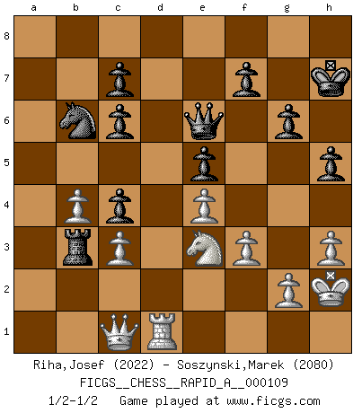 Last move : 1/2-1/2 2011 July 28 21:41:18 [Event "FICGS__CHESS__RAPID_A__000109"] [Site "FICGS"] [Date "2011.07.06"] [Round "1"] [White "Riha,Josef"] [Black "Soszynski,Marek"] [Result "1/2-1/2"] [WhiteElo "2022"] [BlackElo "2080"] 1.e4 e5 2.Nf3 Nc6 3.Bb5 Nf6 4.d3 Bc5 5.c3 O-O 6.O-O d6 7.Nbd2 a6 8.Ba4 h6 9.Bxc6 bxc6 10.Nc4 Be6 11.b3 Re8 12.Be3 Bxc4 13.Bxc5 Bxd3 14.Qxd3 dxc5 15.Qc2 a5 16.Rfd1 Qe7 17.Nd2 a4 18.Nc4 Qe6 19.Nb2 axb3 20.axb3 Reb8 21.Rxa8 Rxa8 22.f3 Nd7 23.Nc4 Nb6 24.Ne3 c4 25.b4 g6 26.Qe2 Kg7 27.h3 h5 28.Kh1 Ra3 29.Qb2 Rb3 30.Qa1 Qc8 31.Qc1 Kh7 32.Kh2 Qe6 1/2-1/2 Ruy Lopez : Berlin defense Kingside Castling by player Black (move 5) Kingside Castling by player White (move 6) This chess game ended in a draw. Follow this game move after move (download)Chess is a fairy tale of 1001 blunders. (Savielly Tartakower) Wenn Du einsam bist, wenn Du Dich in der Welt wie ein Fremder fühlst, spiele Schach. Das wird Deinen Geist erheben und Dein Ratgeber im Kampf sein. (Aristoteles) El Ajedrez no es como la vida... ¡tiene reglas!. (Mark Pasternak) On peut tirer plus d'utilité d'une partie perdue que de 100 parties gagnées. (Capablanca) If only faces could talk... (Pat Summerall, Sportscaster during the Super Bowl)