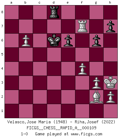 Last move : 1-0 2011 July 24 12:22:22 [Event "FICGS__CHESS__RAPID_A__000109"] [Site "FICGS"] [Date "2011.07.06"] [Round "1"] [White "Velasco,Jose Maria"] [Black "Riha,Josef"] [Result "1-0"] [WhiteElo "1948"] [BlackElo "2022"] 1.e4 e6 2.d4 d5 3.Nc3 dxe4 4.Nxe4 Nd7 5.g3 Ngf6 6.Nxf6+ Nxf6 7.Bg2 Bd6 8.Nf3 O-O 9.O-O Bd7 10.Ne5 Bb5 11.c4 Ba6 12.b3 Nd7 13.Nd3 Rb8 14.a3 Qf6 15.Nb4 c5 16.Nxa6 bxa6 17.Bb2 Rfd8 18.dxc5 Be5 19.Bxe5 Nxe5 20.Qc2 a5 21.Rab1 Qe7 22.b4 axb4 23.axb4 Qc7 24.Rfe1 Rd4 25.Re4 Rd7 26.Qc3 Ng6 27.Rd4 Rxd4 28.Qxd4 Rd8 29.Qe4 Qe7 30.Qb7 Rd7 31.Qb8+ Rd8 32.Qb5 Qc7 33.Qb7 Qxb7 34.Bxb7 Rd4 35.Ba6 Ne5 36.f4 Nxc4 37.Rc1 Ne3 38.c6 Nd5 39.c7 Nxc7 40.Rxc7 g6 41.b5 Rd1+ 42.Kg2 Rd2+ 43.Kh3 Kf8 44.Rxa7 Rb2 45.Ra8+ Ke7 46.Rb8 Ra2 47.Bb7 Rb2 48.Bg2 Rd2 49.b6 Rd8 50.Rb7+ Kd6 51.Rxf7 1-0 French : Rubinstein variation Kingside Castling by player Black (move 8) Kingside Castling by player White (move 9) Player White won this chess game. Follow this game move after move (download)There must have been a time when men were demigods, or they could not have invented Chess. (Gustav Schenk) Spiel ein langweiliges Spiel zu Ende und lustige Dinge können passieren. (Hans Ree) ¿Que sería del Ajedrez sin errores graciosos?. (Kurt Richter) Que feriez-vous si vous étiez en train de jouer aux échecs et que la fin du monde arrive ? Je continuerais à jouer. (Saint Borromée) The obstacle is the path. (Zen proverb)