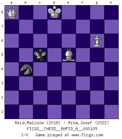 Last move : 1-0 2011 September 10 8:12:56 [Event "FICGS__CHESS__RAPID_A__000109"] [Site "FICGS"] [Date "2011.07.06"] [Round "1"] [White "Reid,Malcolm"] [Black "Riha,Josef"] [Result "1-0"] [WhiteElo "2018"] [BlackElo "2022"] 1.b3 e5 2.Bb2 Nc6 3.e3 Nf6 4.Bb5 Bd6 5.Ne2 a6 6.Bxc6 dxc6 7.O-O Qe7 8.a4 h5 9.Na3 h4 10.Nc4 h3 11.g3 Bf5 12.d3 O-O-O 13.e4 Bg6 14.Qc1 Nd7 15.Nxd6+ cxd6 16.b4 d5 17.exd5 cxd5 18.b5 Rde8 19.bxa6 bxa6 20.Rb1 Qc5 21.Ba3 Qc6 22.f3 Re6 23.Rb3 Qa8 24.Rf2 Rc6 25.Nc3 Rf6 26.Be7 Re6 27.Bb4 f6 28.Qa3 Bf7 29.a5 Rc6 30.Na4 Qa7 31.Bd6 Kd8 32.Nb6 d4 33.Rb2 Re8 34.Na4 Bd5 35.Bb4 g5 36.Qa1 Rg8 37.Qe1 Rg7 38.Nb6 Be6 39.c3 dxc3 40.Bxc3 Qc7 41.Rfc2 Bf5 42.Nd5 Qd6 43.Ne3 Bxd3 44.Bb4 Qc7 45.Rc3 Rxc3 46.Qxc3 Qxc3 47.Bxc3 Re7 48.Rd2 Bb5 49.Rd6 Kc7 50.Bb4 Rf7 51.g4 Bc6 52.Kf2 e4 53.fxe4 Ne5 54.Kg3 Rd7 55.Nd5+ Bxd5 56.Rxd5 Rxd5 57.exd5 Kd7 58.Kxh3 Nd3 59.Bf8 Nf4+ 60.Kg3 Nxd5 61.Kf3 Ke6 62.Ke4 Nf4 63.Bb4 Nd5 64.Be1 Kd6 65.Bg3+ Kc6 66.Bf2 Kd6 67.Kf5 Ke7 68.Bc5+ Kf7 69.Ke4 Ke6 70.Kd4 Nf4 71.Bb4 Kd7 72.Bd2 Ng6 73.Kd5 Nh4 74.Be3 Nf3 75.h3 Ne1 76.Bd4 Nd3 77.Ke4 Nf4 78.h4 Ke6 79.h5 Kf7 80.Bg1 Ke6 81.Bb6 Kf7 82.Bd4 Ke6 83.h6 Kf7 84.h7 Kg7 85.Bxf6+ Kxh7 86.Bxg5 Ne6 87.Be7 Kg6 88.Kd5 Kf7 89.Bc5 Nf4+ 90.Kc6 Ke6 91.Kb6 Kd5 92.Be3 Ng2 93.Bc1 Nh4 94.Kxa6 Kc6 95.g5 Ng6 96.Ka7 Kc7 97.a6 Kc8 98.Be3 Kc7 99.Bb6+ Kc8 100.Bg1 Kc7 101.Bh2+ Kc6 102.Kb8 Nf8 103.g6 Nd7+ 104.Kc8 Nb6+ 105.Kd8 Nd5 106.Be5 Kc5 107.a7 Nb4 108.a8Q 1-0 Nimzovich-Larsen attack : Modern variation Kingside Castling by player White (move 7) Queenside Castling by player Black (move 12) 10 pieces endgame at move 60 : White KBPPP , Black KNPPP WHITE : King + 1 Bishop 3 Pawns BLACK : King + 1 Knight 3 Pawns 9 pieces endgame at move 85 : White KBPPP , Black KNPP WHITE : King + 1 Bishop 3 Pawns BLACK : King + 1 Knight 2 Pawns 8 pieces endgame at move 85 : White KBPP , Black KNPP WHITE : King + 1 Bishop 2 Pawns BLACK : King + 1 Knight 2 Pawns 7 pieces endgame at move 86 : White KBPP , Black KNP WHITE : King + 1 Bishop 2 Pawns BLACK : King + 1 Knight 1 Pawn 6 pieces endgame at move 94 : White KBPP , Black KN WHITE : King + 1 Bishop 2 Pawns BLACK : King + 1 Knight Promotion Queen by player White (move 108) Player White won this chess game. Follow this game move after move (download)Play the opening like a book, the middle game like a magician, and the endgame like a machine. (Spielmann) Alle Schachspieler sollten auch ein Hobby haben. (Savielly Grigorievitsch Tartakower) ¿Cual es el objetivo de jugar una apertura de gambito?... Para adquirir una reputación de ser un jugador apuesto a costo de perder el juego. (Siegbert Tarrasch) Il a essayé de se convaincre qu'il pourrait empêcher toutes les erreurs et ne jamais perdre. L'horreur ! Gary Kasparov au sujet de Robert Fischer. There are two types of people in this world, good and bad. The good sleep better, but the bad seem to enjoy the waking hours much more. (Woody Allen)