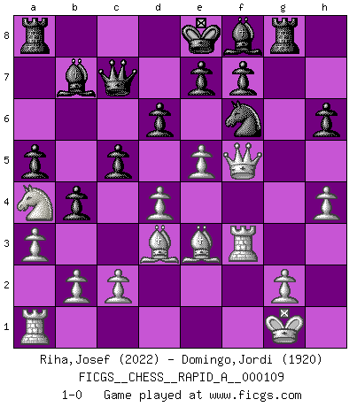 Last move : 1-0 2011 September 1 22:36:14 [Event "FICGS__CHESS__RAPID_A__000109"] [Site "FICGS"] [Date "2011.07.06"] [Round "1"] [White "Riha,Josef"] [Black "Domingo,Jordi"] [Result "1-0"] [WhiteElo "2022"] [BlackElo "1920"] 1.Nc3 g5 2.d4 h6 3.e4 d6 4.h4 g4 5.Be3 c6 6.Bd3 Nf6 7.Nge2 Nbd7 8.Ng3 b5 9.O-O a6 10.f4 gxf3 11.Qxf3 Qc7 12.Nh5 Bb7 13.Qf5 b4 14.Na4 Rg8 15.a3 a5 16.Nxf6+ Nxf6 17.e5 c5 18.Rf3 1-0 Dunst (Sleipner, Heinrichsen) Opening Kingside Castling by player White (move 9) Player White won this chess game. Follow this game move after move (download)A big shock; the best chess player in history has passed away. (Lajos Portisch, about Bobby Fischer's death) Er war ein guter Schachspieler, aber ich kann Leute nicht ausstehen, die 'Heil Hitler' rufen (Über Alexander Aljechin). (Miguel Najdorf) Nada excita más a Grandes Maestros aburridos que una novedad teórica. (Dominic Lawson) Pour se monter efficace, un Cavalier a besoin d'avant-postes ! Les Cavaliers font les meilleurs bloqueurs de pions passés. War is the child of passion, passion is the child of narcissism and narcissism is the child. (...) Another game ? (Thibault de Vassal)