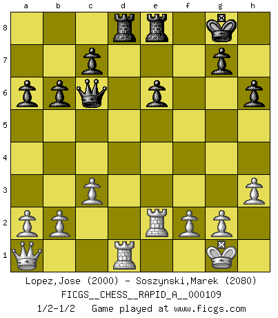 Last move : 1/2-1/2 2011 July 21 7:37:50 [Event "FICGS__CHESS__RAPID_A__000109"] [Site "FICGS"] [Date "2011.07.06"] [Round "1"] [White "Lopez,Jose"] [Black "Soszynski,Marek"] [Result "1/2-1/2"] [WhiteElo "2000"] [BlackElo "2080"] 1.e4 e5 2.Nf3 Nc6 3.Bc4 Bc5 4.c3 Nf6 5.d3 a6 6.Bb3 d6 7.h3 Ba7 8.Nbd2 h6 9.Nf1 O-O 10.Ng3 d5 11.exd5 Nxd5 12.O-O Re8 13.Re1 Be6 14.Nh5 Nf6 15.Nxf6+ Qxf6 16.Be3 Bxe3 17.Rxe3 Rad8 18.Qc2 Qg6 19.Rae1 b6 20.Nxe5 Nxe5 21.Rxe5 Qxd3 22.Qc1 Qd2 23.Qb1 Qd3 24.Qa1 Qd7 25.Rd1 Qc6 26.Bxe6 fxe6 27.Re2 1/2-1/2 Giuoco Piano Kingside Castling by player Black (move 9) Kingside Castling by player White (move 12) This chess game ended in a draw. Follow this game move after move (download)My God, Bobby Fischer plays so simply. (Alexei Suetin) Auf jeden Fall musst du zuerst Rechtsanwalt werden, damit du deine eigenen Interessen und die deiner Familie vertreten kannst. [Brief an seinen Sohn] (José Raúl Capablanca) Si el ingenio solamente fuese necesario para lucirse, las mujeres serían las mejores jugadoras de Ajedrez del mundo. (Albin) Le profane ne songe pas à la somme de jouissance dont il se prive, qui méconnaît ce jeu aux ressources aussi variées que passionnantes. (Jean-Marie Jeanton-Lamarche) A specialist learns more and more about less and less until he knows everything about nothing. (Nicholas Murray Butler)