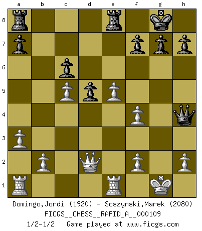 Last move : 1/2-1/2 2011 August 23 17:28:45 [Event "FICGS__CHESS__RAPID_A__000109"] [Site "FICGS"] [Date "2011.07.06"] [Round "1"] [White "Domingo,Jordi"] [Black "Soszynski,Marek"] [Result "1/2-1/2"] [WhiteElo "1920"] [BlackElo "2080"] 1.e4 e5 2.Nf3 Nc6 3.Bc4 Bc5 4.c3 Nf6 5.d4 exd4 6.e5 d5 7.Bb5 Ne4 8.cxd4 Bb4+ 9.Bd2 Nxd2 10.Bxc6+ bxc6 11.Nbxd2 O-O 12.O-O c5 13.a3 Bxd2 14.Qxd2 Bg4 15.dxc5 Bxf3 16.gxf3 c6 17.Rfe1 Re8 18.f4 Qh4 1/2-1/2 Giuoco Piano Kingside Castling by player Black (move 11) Kingside Castling by player White (move 12) This chess game ended in a draw. Follow this game move after move (download)At this time Fischer is simply a level above all the best Chessplayers in the world. (John Jacobs) Ich bin stolz ein Bulgare zu sein. (Veselin Topalov) Una de estas pequeñas movidas modestas pudieran ser mas molestas a tu oponente que la amenaza mas grande. (Siegbert Tarrasch) Psychologiquement, tu dois avoir confiance en toi même, mais cette confiance doit être basée sur des faits. (Robert Fischer) In every real man a child is hidden that wants to play. (Friedrich Nietzsche)