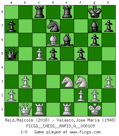 Last move : 1-0 2011 July 13 22:13:49 [Event "FICGS__CHESS__RAPID_A__000109"] [Site "FICGS"] [Date "2011.07.06"] [Round "1"] [White "Reid,Malcolm"] [Black "Velasco,Jose Maria"] [Result "1-0"] [WhiteElo "2018"] [BlackElo "1948"] 1.e4 c5 2.Na3 Nc6 3.Bb5 Nf6 4.Bxc6 bxc6 5.e5 Nd5 6.Nf3 g6 7.O-O Bg7 8.d3 O-O 9.Re1 d6 10.Nc4 Bf5 11.b3 Nb6 12.Ne3 Be6 13.Bb2 d5 14.c3 Rb8 15.Qc2 Nd7 16.d4 Rc8 17.Ba3 cxd4 18.cxd4 Re8 19.Rac1 Qb6 20.h3 Qa5 21.Qb2 f6 22.exf6 exf6 23.Bd6 c5 24.dxc5 f5 25.Qb1 1-0 Sicilian defense Kingside Castling by player White (move 7) Kingside Castling by player Black (move 8) Player White won this chess game. Follow this game move after move (download)When in doubt... play Chess ! (Tevis) Schach wird sich dank seiner hohen kulturellen Tradition immer durchsetzen. In näherer Zukunft womöglich sogar als Gegenreaktion auf die maßlose Reizüberflutung im Freizeit- und Spielbereich. (Garry Kasparov) El Ajedrez es tortura mental. (Garry Kasparov) Je fais ceci parce que dans cinquante coups j'obtiendrai cela; je m'appelle Mikhail Moisevitch Botvinnik. (Botvinnik) Experiences are the keys to life. (Daniel Parmet)