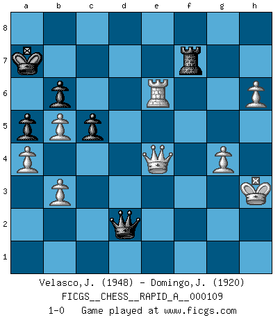 Last move : 1-0 2011 December 12 21:50:51 [Event "FICGS__CHESS__RAPID_A__000109"] [Site "FICGS"] [Date "2011.07.06"] [Round "1"] [White "Velasco,Jose Maria"] [Black "Domingo,Jordi"] [Result "1-0"] [WhiteElo "1948"] [BlackElo "1920"] 1.d4 h6 2.c4 g5 3.Nc3 Bg7 4.h4 g4 5.e4 c5 6.d5 d6 7.Nge2 h5 8.Ng3 Be5 9.Bd3 Nf6 10.Bg5 Nbd7 11.Qa4 Qb6 12.Bd2 Qa6 13.Qc2 b6 14.Nf5 Nf8 15.Nb5 Kd8 16.Nh6 Rh7 17.O-O Qb7 18.g3 a6 19.Nc3 Bd7 20.a4 a5 21.Bg5 Ng6 22.Nf5 Rh8 23.Nb5 Bxb5 24.cxb5 Kc7 25.Rad1 Rae8 26.Rd2 Kb8 27.Bc4 Qc7 28.Rfd1 Nd7 29.Be3 Bf6 30.Be2 Nde5 31.Rc1 Qb7 32.Qb3 Rd8 33.Kh2 Rhe8 34.Qd1 e6 35.dxe6 Rxe6 36.Kg1 Qc7 37.b3 Rd7 38.Nd4 Re8 39.Bf1 Ne7 40.Bg2 Qd8 41.Nf5 Nc8 42.Bf4 Re6 43.Qc2 Ne7 44.Qd1 Nc8 45.f3 gxf3 46.Bxf3 Nxf3+ 47.Qxf3 Be5 48.Bxe5 Rxe5 49.Rf1 Qe8 50.Qxh5 Rxe4 51.Qf3 Qe6 52.h5 d5 53.Kg2 Rd8 54.R1f2 d4 55.Rde2 Rxe2 56.Rxe2 Qd7 57.h6 f6 58.Qf4+ Ka8 59.Qe4+ Kb8 60.Qe6 Qb7+ 61.Kg1 d3 62.Rd2 Qc7 63.Qe4 Qd7 64.Kg2 Ka7 65.Ne3 Kb8 66.Qf4+ Ka7 67.Qxf6 Qb7+ 68.Qf3 Qh7 69.Nf5 Ne7 70.Nxe7 Qxe7 71.Rxd3 Rh8 72.Re3 Qd7 73.Qf6 Rh7 74.Re6 Rf7 75.Qg6 Qd2+ 76.Kh3 Qd7 77.g4 Rf3+ 78.Kg2 Rf7 79.Qe4 Qd2+ 80.Kh3 1-0 Queen's pawn Kingside Castling by player White (move 17) Player White won this chess game. Follow this game move after move (download)I thought the most common mistake [in chess] was the first one: Learning the game :P (Garvin Gray, FICGS forum) Schach ist ein Teil der Kultur, und wenn es mit der Kultur abwärts geht, geht es auch mit dem Schach abwärts. (Mikhail Moiseyevich Botvinik) La vida es como el Ajedrez, con lucha, competición y eventos buenos y malos. (Benjamin Franklin) Nous sommes les pions de la mystérieuse partie d'Echecs jouée par Dieu. Il nous déplace, nous arrête, nous pousse encore, puis nous lance un à un dans la boîte du Néant. Epitaphe sur la tombe de David Janowsky (1868-1927). Computer Science is no more about computers than astronomy is about telescopes. (Edsger W. Dijkstra)