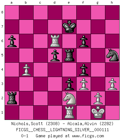 Last move : 0-1 2011 July 6 19:35:11 [Event "FICGS__CHESS__LIGHTNING_SILVER__000111"] [Site "FICGS"] [Date "2011.07.06"] [Round "1"] [White "Nichols,Scott"] [Black "Alcala,Alvin"] [Result "0-1"] [WhiteElo "2308"] [BlackElo "2282"] 1.e4 c5 2.Nf3 d6 3.d4 cxd4 4.Nxd4 Nf6 5.Nc3 a6 6.Be3 e5 7.Nb3 Be6 8.f3 h5 9.Qd2 Nbd7 10.Nd5 Nxd5 11.exd5 Bf5 12.Be2 Qh4+ 13.Bf2 Qf6 14.Bd3 Be7 15.Na5 O-O 16.O-O Rab8 17.c4 Bd8 18.Bxf5 Qxf5 19.Qb4 Qg6 20.Kh1 Bc7 21.Nb3 b5 22.cxb5 Rxb5 23.Qc4 Bd8 24.Rad1 h4 25.h3 Nf6 26.Bxh4 Nh5 27.Rf2 e4 28.Bxd8 e3 29.Rc2 Rxd8 30.Re1 Re8 31.Rc3 Rxd5 32.Qa4 f5 33.Kg1 R8e5 34.Qh4 f4 35.Nc1 Rd2 36.Ne2 Qf6 37.Qxf6 gxf6 38.b4 Rxa2 39.Rc8+ Kf7 40.Rc6 d5 41.Rd6 Ke7 0-1 Sicilian : Najdorf, Byrne (English) attack Kingside Castling by player Black (move 15) Kingside Castling by player White (move 16) Player Black won this chess game. Follow this game move after move (download)Later, I began to succeed in decisive games. Perhaps because I realized a very simple truth: not only was I worried, but also my opponent. (Mikhail Tal) Ich suche im Schach immer etwas Eigenes. Riskantes Spiel im Stile schachlicher Musketiere ist nicht meine Sache, auch wenn es vielen Freunden scharfer Wendungen gefällt. (Anatoly Karpov) ¿Que sería del Ajedrez sin errores graciosos?. (Kurt Richter) Shah mat. Le roi est mort. Cri de fierté d'un joueur venant de terrasser son adversaire, courtoisement, sans effusion de sang. Beep ! (R2D2 in Star Wars ep.3)