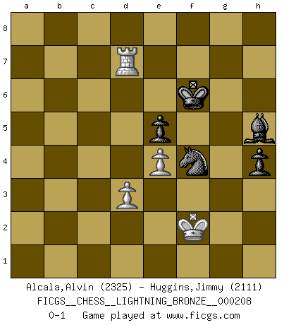 Last move : 0-1 2011 July 6 20:38:27 [Event "FICGS__CHESS__LIGHTNING_BRONZE__000208"] [Site "FICGS"] [Date "2011.07.06"] [Round "1"] [White "Alcala,Alvin"] [Black "Huggins,Jimmy"] [Result "0-1"] [WhiteElo "2325"] [BlackElo "2111"] 1.e4 c5 2.b4 cxb4 3.a3 e5 4.Nf3 Nc6 5.Bc4 Nf6 6.Qe2 Be7 7.O-O O-O 8.axb4 Bxb4 9.c3 Bc5 10.d3 d6 11.Ba3 a6 12.Bxc5 dxc5 13.Qa2 Qd6 14.Nbd2 Bd7 15.Ng5 Qe7 16.Rfb1 b5 17.Bxf7+ Rxf7 18.Qxf7+ Qxf7 19.Nxf7 Kxf7 20.Rxb5 axb5 21.Rxa8 b4 22.cxb4 cxb4 23.Ra6 Ke7 24.Kf1 Kd6 25.Nb3 Nh5 26.g3 g5 27.f3 Ng7 28.Ke2 Ne6 29.Kd2 Nc5 30.Nxc5 Kxc5 31.Ra8 Nd4 32.Rf8 h5 33.h4 gxh4 34.gxh4 Bb5 35.Rf7 Ba4 36.Rc7+ Kd6 37.Rf7 Be8 38.Rf6+ Ke7 39.Rb6 Nxf3+ 40.Kc1 Nxh4 41.Rxb4 Nf3 42.Kd1 Kf6 43.Rb8 Bf7 44.Ke2 Nd4+ 45.Kf2 h4 46.Rf8 Ne6 47.Rh8 Kg5 48.Rh7 Bh5 49.Re7 Kf6 50.Rd7 Nf4 0-1 Sicilian : wing gambit, Marshall variation Kingside Castling by player White (move 7) Kingside Castling by player Black (move 7) 10 pieces endgame at move 40 : White KRPP , Black KBNPPP WHITE : King + 1 Rook 2 Pawns BLACK : King + 1 Bishop 1 Knight 3 Pawns 9 pieces endgame at move 41 : White KRPP , Black KBNPP WHITE : King + 1 Rook 2 Pawns BLACK : King + 1 Bishop 1 Knight 2 Pawns Player Black won this chess game. Follow this game move after move (download)I like the moment when I break a man's ego. (Bobby Fischer) Ich habe Putins Aufstieg an die Macht beobachtet und seine Politik, die demokratischen Institutionen meines Landes zu zerstören. (Garry Kasparov) El Peón aislado arroja penumbra sobre todo el tablero. (Aaron Nimzovich) Tous ces prétendus hommes politiques sont les pions, les Cavaliers, les Tours ou les Fous d'une partie d'échecs qui se jouera tant qu'un hasard ne renversera pas l'échiquier. (Honoré de Balzac) Being number two sucks. (Andre Agassi)