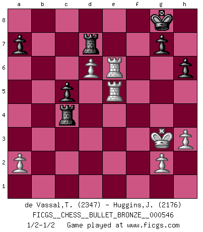 Last move : 1/2-1/2 2011 July 6 22:44:1 [Event "FICGS__CHESS__BULLET_BRONZE__000546"] [Site "FICGS"] [Date "2011.07.06"] [Round "1"] [White "de Vassal,Thibault"] [Black "Huggins,Jimmy"] [Result "1/2-1/2"] [WhiteElo "2347"] [BlackElo "2176"] 1.e4 c5 2.Nf3 Nc6 3.d4 cxd4 4.Nxd4 Nf6 5.Nc3 d6 6.Be3 Ng4 7.Bb5 Nxe3 8.fxe3 Bd7 9.O-O e6 10.Bxc6 bxc6 11.e5 Be7 12.exd6 Bxd6 13.Qh5 O-O 14.Ne4 Be7 15.Rad1 Qb6 16.Rf3 f5 17.Ng5 Bxg5 18.Qxg5 Rf7 19.b3 c5 20.Ne2 Bc6 21.Rf2 h6 22.Qh4 Re8 23.h3 e5 24.Qc4 Qb4 25.Rd6 Bb7 26.Nc3 Qxc4 27.bxc4 f4 28.Nd5 Bxd5 29.cxd5 fxe3 30.Re2 Ref8 31.Rxe3 Rf1+ 32.Kh2 R1f2 33.c4 Rc2 34.Rxe5 R8f2 35.Rg6 Rxc4 36.d6 Rf7 37.Rge6 Rd7 38.Kg3 1/2-1/2 Sicilian defense Kingside Castling by player White (move 9) Kingside Castling by player Black (move 13) This chess game ended in a draw. Follow this game move after move (download)Many Chess players were surprised when after the game, Fischer quietly explained: 'I had already analyzed this possibility' in a position which I thought was not possible to foresee from the opening. (Mikhail Tal) Kleine Schachspieler machen Mist, und große Schachspieler machen Mist, aber große machen weniger Mist. (Fritz Sämisch) Una clavada es mas poderosa que una espada. (Fred Reinfeld) Vous n'êtes pas toujours obligé de jouer le meilleur coup. Un coup doit être actif, entreprenant, correct et beau ! (David Bronstein) Nothing is more important for teaching us to understand the concepts we have than constructing fictitious ones. (Ludwig Wittgenstein)