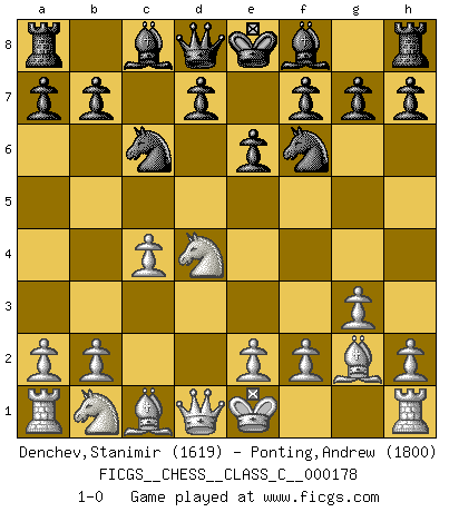 Last move : 1-0 2011 August 20 16:19:19 [Event "FICGS__CHESS__CLASS_C__000178"] [Site "FICGS"] [Date "2011.07.07"] [Round "1"] [White "Denchev,Stanimir"] [Black "Ponting,Andrew"] [Result "1-0"] [WhiteElo "1619"] [BlackElo "1800"] 1.c4 c5 2.Nf3 Nc6 3.d4 cxd4 4.Nxd4 Nf6 5.g3 e6 6.Bg2 1-0 English : Symmetrical variation Player White won this chess game. Follow this game move after move (download)A bad plan is better than none at all. (Frank Marshall) Was ist der Unterschied zwischen einem Strassenarbeiter und einem Schachspieler? --Der Schachspieler bewegt sich ab und zu. (Anonymous) El Ajedrez por encima de todo... ¡es una pelea!. (Emanuel Lasker) Les Echecs sont affaire de jugement sensible. Savoir quand frapper et quand esquiver. (Fischer) Animated gif is worth one mega-word. (Unknown)