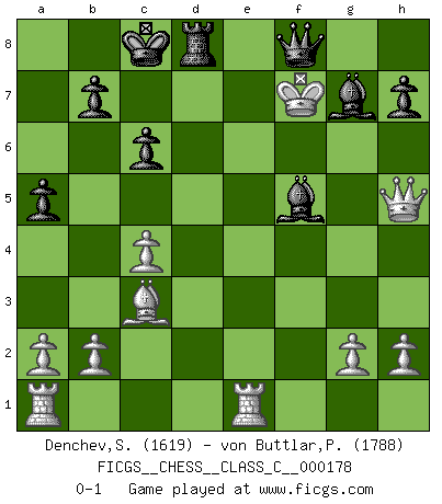 Last move : 0-1 2011 November 10 10:4:31 [Event "FICGS__CHESS__CLASS_C__000178"] [Site "FICGS"] [Date "2011.07.07"] [Round "1"] [White "Denchev,Stanimir"] [Black "von Buttlar,Paul"] [Result "0-1"] [WhiteElo "1619"] [BlackElo "1788"] 1.d4 Nf6 2.Nf3 d5 3.c4 e6 4.Nc3 c6 5.Bg5 Nbd7 6.e4 dxe4 7.Nxe4 Qb6 8.Nxf6+ gxf6 9.Bc1 e5 10.dxe5 fxe5 11.Bd3 Nc5 12.Nxe5 Bg7 13.Qh5 Qa5+ 14.Kd1 Be6 15.Bd2 Qc7 16.Re1 Nxd3 17.Nxd3 O-O-O 18.Kc2 Rxd3 19.Kxd3 Qd7+ 20.Kc2 Bf5+ 21.Kb3 Qd3+ 22.Bc3 Qc2+ 23.Kb4 a5+ 24.Kc5 Qxf2+ 25.Kd6 Rd8+ 26.Ke7 Qc5+ 27.Kxf7 Qf8+ 0-1 Queen's pawn game Queenside Castling by player Black (move 17) Player Black won this chess game. Follow this game move after move (download)You must take your opponent into a deep dark forest where 2+2=5, and the path leading out is only wide enough for one. (Mikhail Tal) Auf Remis zu spielen ist gewissermaßen ein Verbrechen gegen das Schachspiel. (Mikhail Nekhemyevich Tal) Muchos se han convertido en Maestros de Ajedrez, nadie se ha convertido en el Maestro del Ajedrez. (Siegbert Tarrasch) Le pion, dans sa simplicité, marche droit devant lui, mais lorsqu'il prend, il le fait obliquement? Ainsi l'homme, tant qu'il reste pauvre, marche dans la droiture et vit honnêtement, mais lorsqu'il recherche les honneurs, il flatte, se parjure et, par les voies obliques, cherche une position supérieure sur l'échiquier du monde. (Jean de Galles) That's absurd. I love it. (Gregory House, House M.D.)