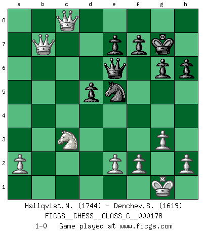 Last move : 1-0 2011 August 31 9:31:49 [Event "FICGS__CHESS__CLASS_C__000178"] [Site "FICGS"] [Date "2011.07.07"] [Round "1"] [White "Hallqvist,Niklas"] [Black "Denchev,Stanimir"] [Result "1-0"] [WhiteElo "1744"] [BlackElo "1619"] 1.c4 c5 2.g3 Nf6 3.Bg2 Nc6 4.Nf3 d6 5.O-O g6 6.d4 cxd4 7.Nxd4 Nxd4 8.Qxd4 Bg7 9.Nc3 O-O 10.Bg5 Rb8 11.Qxa7 Be6 12.c5 Ra8 13.Qxb7 Rb8 14.Qa7 Rxb2 15.c6 h6 16.Be3 Ng4 17.Bd4 Ne5 18.Rab1 Nc4 19.Bxg7 Kxg7 20.Rxb2 Nxb2 21.Rb1 Nc4 22.c7 Qd7 23.Rb8 Rc8 24.Rxc8 Qxc8 25.Bd5 Ne5 26.Bxe6 Qxe6 27.Qb7 d5 28.c8Q 1-0 English : Symmetrical variation Kingside Castling by player White (move 5) Kingside Castling by player Black (move 9) Promotion Queen by player White (move 28) Player White won this chess game. Follow this game move after move (download)A thorough understanding of the typical mating continuations makes the most complicated sacrificial combinations leading up to them not only not difficult, but almost a matter of course. (Siegbert Tarrasch) Ein Teil des Fehlers ist immer korrekt. (Savielly Grigorievitsch Tartakower) Aún el Rey más flojo huye despavorido ante la amenaza de un Jaque doble. (Aaron Nimzowitsch) Donnez-moi un Cavalier en 6e et je gagnerais toutes mes parties. (Steinitz) Hold em is to stud what chess is to checkers. (Johnny Moss)