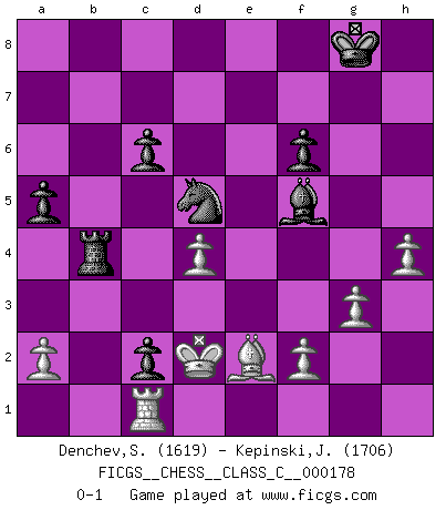 Last move : 0-1 2011 September 15 9:1:4 [Event "FICGS__CHESS__CLASS_C__000178"] [Site "FICGS"] [Date "2011.07.07"] [Round "1"] [White "Denchev,Stanimir"] [Black "Kepinski,Janusz"] [Result "0-1"] [WhiteElo "1619"] [BlackElo "1706"] 1.d4 Nf6 2.Nf3 e6 3.c4 d5 4.Bg5 Bb4+ 5.Nc3 dxc4 6.e4 Bxc3+ 7.bxc3 h6 8.Bxf6 Qxf6 9.Bxc4 c6 10.O-O O-O 11.Qe2 Nd7 12.e5 Qf4 13.h3 h5 14.g3 Qh6 15.h4 b5 16.Bb3 a5 17.Ng5 Nb6 18.Bd1 Nd5 19.Rc1 f6 20.exf6 gxf6 21.Nxe6 Re8 22.Qxh5 Qxh5 23.Bxh5 Rxe6 24.Rfe1 Rxe1+ 25.Rxe1 Bd7 26.c4 bxc4 27.Rc1 c3 28.Bf3 Rc8 29.Kf1 Bf5 30.Ke2 c2 31.Kd2 Rb8 32.Be2 Rb4 0-1 Queen's pawn game Kingside Castling by player White (move 10) Kingside Castling by player Black (move 10) Player Black won this chess game. Follow this game move after move (download)It is always better to sacrifice your opponent's men. (Savielly Tartakower) Es war undenkbar für die Behörden, dass ein sowjetischer Großmeister auf diese Art und Weise [Fischer-Taimanov 6:0] verliert, ohne dass es eine politischer Erklärung dafür gäbe. (Mark Taimanov) Yo siempre he tenido un ligero sentimiento de lástima por una persona que no tiene conocimiento del Ajedrez. (Siegbert Tarrasch) Les Cavaliers se révèlent fort utiles dans les positions fermées. D'habitude, les Fous sont un peu plus forts que les Cavaliers dans les positions ouvertes. Qu'on le veuille ou non, il restera toujours des exceptions ! I feel so... helpless. (C-3PO in Star Wars ep.3)