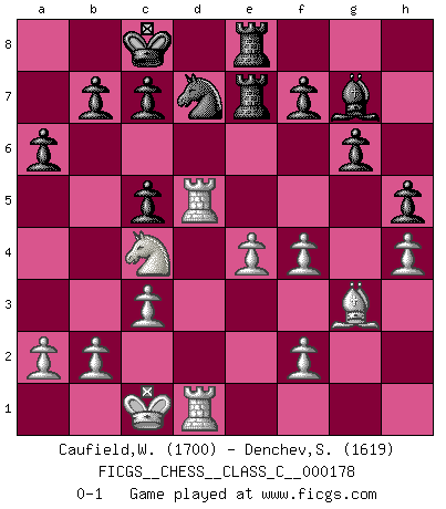 Last move : 0-1 2011 December 16 16:34:29 [Event "FICGS__CHESS__CLASS_C__000178"] [Site "FICGS"] [Date "2011.07.07"] [Round "1"] [White "Caufield,William"] [Black "Denchev,Stanimir"] [Result "0-1"] [WhiteElo "1700"] [BlackElo "1619"] 1.e4 e5 2.Nf3 Nc6 3.Bb5 a6 4.Bxc6 dxc6 5.d4 exd4 6.Qxd4 Qxd4 7.Nxd4 c5 8.Nf3 Bg4 9.Be3 Bxf3 10.gxf3 g6 11.Nd2 Nf6 12.Nc4 Nd7 13.O-O-O O-O-O 14.h4 h5 15.Bg5 Re8 16.Bf4 Bg7 17.Rd5 Bd4 18.c3 Bf6 19.Rhd1 Re7 20.Bg3 Rhe8 21.f4 Bg7 0-1 This chess game has been lost on time (started : 2011.07.07 17:51:4) Ruy Lopez : Exchange variation Queenside Castling by player White (move 13) Queenside Castling by player Black (move 13) Player Black won this chess game. Follow this game move after move (download)Chess is a fighting game which is purely intellectual and includes chance. (Richard Reti) Das Spiel gibt uns die Genugtuung, die das Leben uns versagt. (Emanuel Lasker) Repentinamente, me resultaba obvio en mi analisis que yo había pasado por alto lo que Fischer había visto en el tablero con la mas grande facilidad. (Mikhail Botvinnik) Un footballeur joue avec ses pieds, parfois avec sa tête. Un joueur d'échecs ne joue qu'avec sa tête. Et quand il ne joue plus, il meurt. (Jacob Murray) The intuitive mind is a sacred gift; the rational mind is a faithful servant. We have created a society that honors the servant but has forgotten the gift. (Albert Einstein)