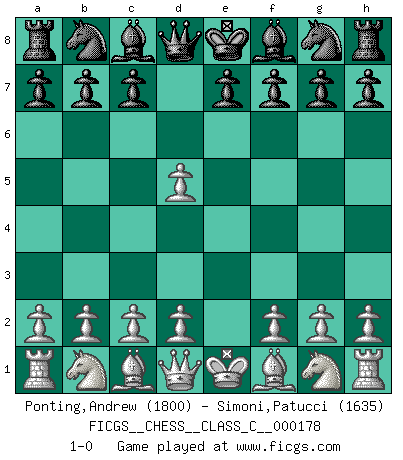 Last move : 1-0 2011 August 22 21:58:51 [Event "FICGS__CHESS__CLASS_C__000178"] [Site "FICGS"] [Date "2011.07.07"] [Round "1"] [White "Ponting,Andrew"] [Black "Simoni,Patucci"] [Result "1-0"] [WhiteElo "1800"] [BlackElo "1635"] 1.e4 d5 2.exd5 1-0 This chess game has been lost on time (started : 2011.07.07 17:51:4) Scandinavian (centre counter) defense Player White won this chess game. Follow this game move after move (download)I play correspondence chess because it is both art and science while chess is art only. (A player at FICGS) Die starken Figuren des Gegners muss man abtauschen. (José Raúl Capablanca) Robert Fischer es la ley hacia si mismo. (Larry Evans) Même si l'adversaire joue le coup analysé précédemment, recommencez l'analyse en voyant la nouvelle position. Première règle de Blumenfeld The hypothalamus is one of the most important parts of the brain, involved in many kinds of motivation, among other functions. The hypothalamus controls the 'Four Fs: Fighting, Fleeing, Feeding and Mating. (Unknown author)