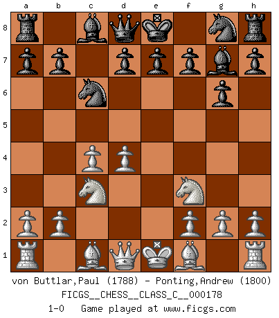 Last move : 1-0 2011 August 20 16:17:50 [Event "FICGS__CHESS__CLASS_C__000178"] [Site "FICGS"] [Date "2011.07.07"] [Round "1"] [White "von Buttlar,Paul"] [Black "Ponting,Andrew"] [Result "1-0"] [WhiteElo "1788"] [BlackElo "1800"] 1.c4 c5 2.Nc3 Nc6 3.Nf3 g6 4.e3 Bg7 5.d4 cxd4 6.exd4 1-0 English : Symmetrical variation Player White won this chess game. Follow this game move after move (download)Fischer is the strongest player in the world. In fact, the strongest player who ever lived. (Larry Evans) Wie bekannt hörte Morphy 1859 auf, Schach zu spielen. Seine Enttäuschung galt nicht so sehr dem Schach, wie den Schachspielern. (Robert James Fischer) El Ajedrez es tan interesante por sí solo, que no es necesario un interés monetario para persuadir a una persona a que lo practique; por lo tanto, nunca se juega por dinero. (Benjamin Franklin) Je fais ceci parce que dans cinquante coups j'obtiendrai cela; je m'appelle Mikhail Moisevitch Botvinnik. (Botvinnik) Wawaweewa ! (Borat: Cultural learnings of America for make benefit glorious nation of Kazakhstan)