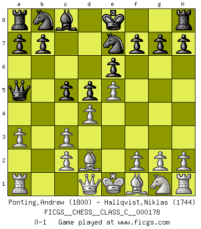 Last move : 0-1 2011 August 20 16:17:4 [Event "FICGS__CHESS__CLASS_C__000178"] [Site "FICGS"] [Date "2011.07.07"] [Round "1"] [White "Ponting,Andrew"] [Black "Hallqvist,Niklas"] [Result "0-1"] [WhiteElo "1800"] [BlackElo "1744"] 1.e4 e6 2.d4 d5 3.Nc3 Bb4 4.e5 c5 5.a3 Bxc3+ 6.bxc3 Qa5 7.Bd2 Ne7 0-1 French : Winawer, Advance variation Player Black won this chess game. Follow this game move after move (download)Place the contents of the Chess box in a hat, shake them up vigorously, pour them on the board from a height of two feet, and you get the style of Steinitz. (H. E. Bird) Jeder leidlich begabte Spieler, er braucht keineswegs hervorragend veranlagt zu sein, kann es zum Meister bringen. Aber das ist ja auch gar nicht nötig! Der richtige Standpunkt ist es, zu seinem Vergnügen zu spielen, und man glaube ja nicht, dass der Genuss proportional dem Können sei. (Siegbert Tarrasch) Yo nunca en mi vida he jugado la Defensa Francesa, que viene siendo la más aburrida de todas las Aperturas. (Wilhelm Steinitz) Les échecs, c'est l'imagination. (David Bronstein) Political correctness is subjecting us to gross incompetence. (Johann Piek)