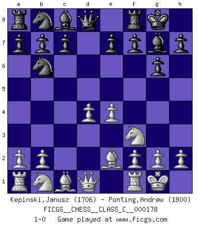 Last move : 1-0 2011 August 20 16:16:56 [Event "FICGS__CHESS__CLASS_C__000178"] [Site "FICGS"] [Date "2011.07.07"] [Round "1"] [White "Kepinski,Janusz"] [Black "Ponting,Andrew"] [Result "1-0"] [WhiteElo "1706"] [BlackElo "1800"] 1.d4 Nf6 2.c4 g6 3.Nf3 Bg7 4.e3 O-O 5.Be2 d5 6.cxd5 Nxd5 7.e4 Nb6 8.O-O 1-0 King's Indian, 3.Nf3 Kingside Castling by player Black (move 4) Kingside Castling by player White (move 8) Player White won this chess game. Follow this game move after move (download)All I want to do, ever, is just play Chess. (Bobby Fischer) Fischer ist das größte Genie, das je vom Schachhimmel heruntergestiegen ist. (Mikhail Nekhemyevich Tal) El pensamiento metódico es mas útil en el Ajedrez que la inspiración. (C. J. S. Purdy) En blitz, le Cavalier l'emporte sur le Fou. (Vlastimil Hort) Success without honor is an unseasoned dish; it will satisfy your hunger, but it won't taste good. (Joe Paterno)