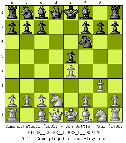 Last move : 0-1 2011 August 21 9:59:46 [Event "FICGS__CHESS__CLASS_C__000178"] [Site "FICGS"] [Date "2011.07.07"] [Round "1"] [White "Simoni,Patucci"] [Black "von Buttlar,Paul"] [Result "0-1"] [WhiteElo "1635"] [BlackElo "1788"] 1.e4 e6 2.d3 d5 3.Nd2 Nf6 4.g3 dxe4 5.dxe4 e5 0-1 This chess game has been lost on time (started : 2011.07.07 17:51:4) French : King's Indian attack Player Black won this chess game. Follow this game move after move (download)A Chess game is a dialogue, a conversation between a player and his opponent. Each move by the opponent may contain threats or be a blunder, but a player cannot defend against threats or take advantage of blunders if he does not first ask himself: What is my opponent planning after each move ? (Bruce A. Moon) Ich moechte nie einem Club beitreten, der Leute wie mich als Mitglieder aufnimmt. (Woody Allen) No nos podemos resistir a la fascinación de un sacrificio ya que la pasión por los sacrificios es parte de la naturaleza de un jugador de Ajedrez. (Rudolf Spielman) Le succès, c'est être capable d'aller d'échec en échec sans perdre son enthousiasme. (Winston Churchill) Wisdom is the reward you get for a lifetime of listening when you'd have preferred to talk. (Doug Larson)