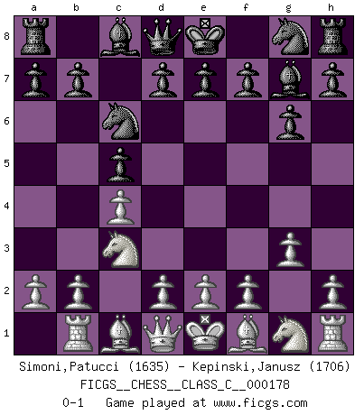 Last move : 0-1 2011 August 19 21:51:28 [Event "FICGS__CHESS__CLASS_C__000178"] [Site "FICGS"] [Date "2011.07.07"] [Round "1"] [White "Simoni,Patucci"] [Black "Kepinski,Janusz"] [Result "0-1"] [WhiteElo "1635"] [BlackElo "1706"] 1.c4 c5 2.Nc3 g6 3.g3 Bg7 4.Rb1 Nc6 0-1 This chess game has been lost on time (started : 2011.07.07 17:51:4) English : Symmetrical variation Player Black won this chess game. Follow this game move after move (download)Chess makes man wiser and clear-sighted. (Vladimir Putin) Ich habe kein Problem mit Frauen, sondern nur mit dem Niveau ihres Schachspiels (Judith Polgar) El Ajedrez es una guerra en un tablero. El objetivo es aplastar la mente del oponente. (Bobby Fischer) Shah mat. Le roi est mort. Cri de fierté d'un joueur venant de terrasser son adversaire, courtoisement, sans effusion de sang. You must do what you feel is right... of course. (Obi-Wan Kenobi in Star Wars ep.4)