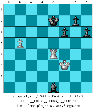 Last move : 1-0 2011 September 5 9:29:37 [Event "FICGS__CHESS__CLASS_C__000178"] [Site "FICGS"] [Date "2011.07.07"] [Round "1"] [White "Hallqvist,Niklas"] [Black "Kepinski,Janusz"] [Result "1-0"] [WhiteElo "1744"] [BlackElo "1706"] 1.e4 e6 2.d4 d5 3.Nd2 Nf6 4.e5 Ne4 5.f3 Nxd2 6.Qxd2 c5 7.Bb5+ Bd7 8.Bxd7+ Nxd7 9.c3 cxd4 10.cxd4 a5 11.Qd3 Be7 12.f4 O-O 13.Nf3 h6 14.O-O Qb6 15.Be3 Rfc8 16.f5 exf5 17.Qxf5 Qe6 18.Qd3 Qa6 19.Ne1 a4 20.g3 Qxd3 21.Nxd3 Nb6 22.Rac1 Rc4 23.Kg2 Rac8 24.h4 R4c6 25.Rxc6 bxc6 26.b3 axb3 27.axb3 Nd7 28.Rc1 f6 29.e6 Nf8 30.Nf4 Ba3 31.Rc2 Bd6 32.Nxd5 Nxe6 33.b4 Rd8 34.Rxc6 Kf7 35.Rb6 Bxg3 36.Rb7+ Kf8 37.Ne7 Rb8 38.Ng6+ Kg8 39.Rd7 Be1 40.Ne7+ Kh7 41.Nc6 Rc8 42.d5 Bxh4 43.dxe6 Rxc6 44.e7 Re6 45.Bc5 Kg6 46.Rd8 Re2+ 47.Kf3 Rxe7 48.Bxe7 Kf7 49.b5 Kxe7 50.Rd4 Be1 51.Re4+ 1-0 French : Tarrasch, Closed variation Kingside Castling by player Black (move 12) Kingside Castling by player White (move 14) 10 pieces endgame at move 47 : White KRBP , Black KRBPPP WHITE : King + 1 Rook 1 Bishop 1 Pawn BLACK : King + 1 Rook 1 Bishop 3 Pawns 9 pieces endgame at move 48 : White KRBP , Black KBPPP WHITE : King + 1 Rook 1 Bishop 1 Pawn BLACK : King + 1 Bishop 3 Pawns 8 pieces endgame at move 49 : White KRP , Black KBPPP WHITE : King + 1 Rook 1 Pawn BLACK : King + 1 Bishop 3 Pawns Player White won this chess game. Follow this game move after move (download)He who fears an isolated Queen's Pawn should give up Chess. (Siegbert Tarrasch) Als er Schachweltmeister wurde ließ er praktisch alle stärksten Sovietspieler für sich arbeiten. Wenn ein auch nur mittelmässiger Meister ein Spezialist für eine bestimmte Eröffnung war, wurde er von Karpov gerufen. Das wurde alles geheim gehalten. (Mikhail Moiseyevich Botvinik) Aún el Rey más flojo huye despavorido ante la amenaza de un Jaque doble. (Aaron Nimzowitsch) Il s'avisa de me proposer d'apprendre les échecs qu'il jouait un peu... me voilà forcené des échecs. J'achète un échiquier, je m'enferme dans ma chambre, j'y passe des jours et des nuits à vouloir apprendre par cur toutes les parties. (Jean-Jacques Rousseau, Confessions) I fear not the man who has practiced 10,000 kicks once, but I fear the man who has practiced one kick 10,000 times. (Bruce Lee)
