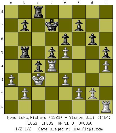 Last move : 1/2-1/2 2011 September 10 21:31:55 [Event "FICGS__CHESS__RAPID_D__000060"] [Site "FICGS"] [Date "2011.07.08"] [Round "1"] [White "Hendricks,Richard"] [Black "Ylonen,Olli"] [Result "1/2-1/2"] [WhiteElo "1329"] [BlackElo "1484"] 1.d4 Nf6 2.Nf3 d5 3.Bf4 c5 4.c3 Nc6 5.e3 Qb6 6.Qb3 c4 7.Qxb6 axb6 8.Be2 Bf5 9.Nbd2 e6 10.Nh4 Bg6 11.Nxg6 hxg6 12.Bg3 Nh5 13.Bxh5 gxh5 14.h4 b5 15.a3 g6 16.Be5 Nxe5 17.dxe5 b4 18.cxb4 Bxb4 19.Ke2 Bxd2 20.Kxd2 Kd7 21.Kc3 Ra5 22.Rad1 Rb5 23.Rd4 Rc8 1/2-1/2 Queen's pawn game This chess game ended in a draw. Follow this game move after move (download)Chess demands total concentration. (Bobby Fischer) Man braucht nicht immer den besten Zug zu spielen: Ein Zug muß aktiv, unternehmungslustig, korrekt und schön sein. (David Bronstein) Robert Fischer es la ley hacia si mismo. (Larry Evans) Les échecs, c'est la lutte contre l'erreur. (Johannes Zukertort) At last I discovered the true beauty of chess. So I proposed to her. (Dinesh De Silva)