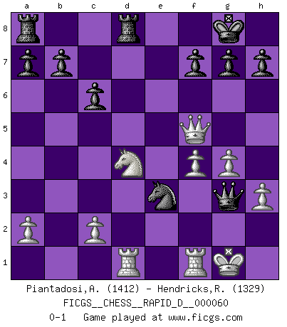 Last move : 0-1 2011 August 16 1:14:25 [Event "FICGS__CHESS__RAPID_D__000060"] [Site "FICGS"] [Date "2011.07.08"] [Round "1"] [White "Piantadosi,Angelo"] [Black "Hendricks,Richard"] [Result "0-1"] [WhiteElo "1412"] [BlackElo "1329"] 1.e4 d5 2.exd5 Qxd5 3.Nc3 Qa5 4.d4 c6 5.Nf3 Nf6 6.Bd3 Bg4 7.O-O Nbd7 8.Bd2 Qc7 9.h3 Bh5 10.g4 Bg6 11.Be3 e6 12.Qd2 Bd6 13.Kg2 O-O 14.Ne2 Bxd3 15.Qxd3 e5 16.dxe5 Nxe5 17.Nxe5 Bxe5 18.f4 Rfd8 19.Qf5 Bxb2 20.Rad1 Qe7 21.Kf2 Nd5 22.Bd4 Qh4+ 23.Kg2 Bxd4 24.Nxd4 Ne3+ 25.Kg1 Qg3+ 0-1 Scandinavian (centre counter) defense Kingside Castling by player White (move 7) Kingside Castling by player Black (move 13) Player Black won this chess game. Follow this game move after move (download)Personally, I rather look forward to a computer program winning the world Chess Championship. Humanity needs a lesson in humility. (Richard Dawkings) Im Internet Chess Club betrug mein Rating vorübergehend 3350 ELO-Punkte. (Sergej Karjakin) Cuando tengas duda... ¡juega al Ajedrez!. (Tevis) Les Cavaliers se révèlent fort utiles dans les positions fermées. D'habitude, les Fous sont un peu plus forts que les Cavaliers dans les positions ouvertes. Qu'on le veuille ou non, il restera toujours des exceptions ! Crush them ! Make them suffer ! (General Grievous in Star Wars ep.3)