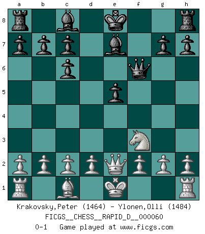Last move : 0-1 2011 August 12 8:21:41 [Event "FICGS__CHESS__RAPID_D__000060"] [Site "FICGS"] [Date "2011.07.08"] [Round "1"] [White "Krakovsky,Peter"] [Black "Ylonen,Olli"] [Result "0-1"] [WhiteElo "1464"] [BlackElo "1484"] 1.e4 e5 2.Nf3 Nc6 3.Bb5 f5 4.Nc3 fxe4 5.Nxe4 Nf6 6.Nxf6+ Qxf6 7.Qe2 Be7 8.Bxc6 dxc6 0-1 Ruy Lopez : Schliemann defense, Berger variation Player Black won this chess game. Follow this game move after move (download)Chess is the art which expresses the science of logic. (Mikhail Botvinnik) Ich war schon mal beim Dopingtest. Da musste ich Urin abgeben, während Dritte zusahen. (Elisabeth Pähtz) Un Peón pasado es un criminal, quién debe ser mantenido bajo candado y llave. Leves medidas, tales como vigilancia policiaca, no son suficientes. (Aaron Nimzovich) J'ai vu le vaincu d'Echecs jouer des années durant dans l'espoir de la fête de la victoire. Car tu es plus riche de ce qu'elle existe si même elle n'est point pour toi. Ainsi de la perle du fond des mers. (Antoine de Saint-Exupéry) Computers make it easier to do a lot of things, but most of the things they make it easier to do don't need to be done. (Andy Rooney)