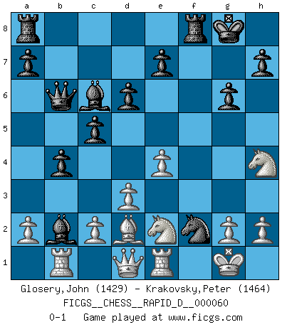 Last move : 0-1 2011 August 15 16:36:31 [Event "FICGS__CHESS__RAPID_D__000060"] [Site "FICGS"] [Date "2011.07.08"] [Round "1"] [White "Glosery,John"] [Black "Krakovsky,Peter"] [Result "0-1"] [WhiteElo "1429"] [BlackElo "1464"] 1.e4 c5 2.Nc3 d6 3.f4 Nc6 4.Bb5 Bd7 5.Nf3 g6 6.O-O Bg7 7.Re1 Nf6 8.d3 O-O 9.Bxc6 Bxc6 10.Nh4 b5 11.f5 b4 12.Ne2 Qb6 13.fxg6 fxg6 14.Be3 Ng4 15.Bd2 Bxb2 16.Rb1 Nf2 0-1 Sicilian : Closed Kingside Castling by player White (move 6) Kingside Castling by player Black (move 8) Player Black won this chess game. Follow this game move after move (download)We like to think. (Gary Kasparov) Schach ist das schnellste Spiel der Welt, weil man in jeder Sekunde Tausende von Gedanken ordnen muß. (Albert Einstein) Un jugador que trata de regresar una movida en el Ajedrez es un futuro carterista. (Richard Fenton) C'est une question de caractère, Beaucoup de gens perdent leur motivation très vite. D'autres, ils sont rares, peuvent la conserver très longtemps. J'aime les échecs, encore aujourd'hui je suis heureux d'analyser des parties. J'aime toujours gagner, je déteste encore perdre. Bien jouer est important pour mon intégrité intellectuelle et morale. Et puis les échecs vivent en ce moment une période historique grâce à Internet. Ils se développent dans les systèmes éducatifs à travers le monde. Ils sortent de leur ghetto, et c'est mon rôle de mener à bien cette révolution. (Gary Kasparov) Lamb in skin of tiger, still fears the wolf. (Chinese proverb)