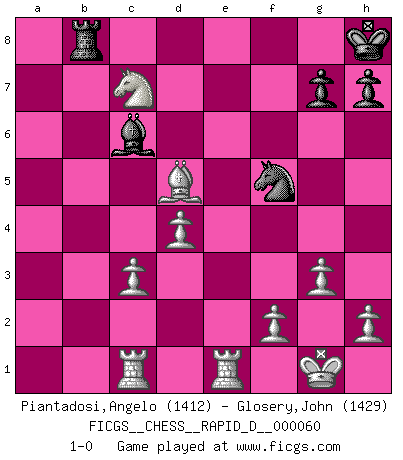 Last move : 1-0 2011 September 4 4:39:33 [Event "FICGS__CHESS__RAPID_D__000060"] [Site "FICGS"] [Date "2011.07.08"] [Round "1"] [White "Piantadosi,Angelo"] [Black "Glosery,John"] [Result "1-0"] [WhiteElo "1412"] [BlackElo "1429"] 1.d4 Nf6 2.c4 a6 3.Nc3 e6 4.Nf3 Bb4 5.Bd2 O-O 6.g3 Bxc3 7.Bxc3 Ne4 8.Bg2 Nxc3 9.bxc3 c6 10.O-O d5 11.cxd5 cxd5 12.a4 Bd7 13.Rb1 b5 14.axb5 Bxb5 15.Re1 Nd7 16.Nd2 Rc8 17.Qb3 Qc7 18.Rbc1 Nb6 19.e4 Nc4 20.Re2 Nb6 21.R2e1 Ba4 22.Qa3 Bb5 23.Nb3 Nc4 24.Qa2 Nd6 25.exd5 Bc4 26.dxe6 fxe6 27.Qc2 Nf5 28.Nc5 Rce8 29.Bf1 Bd5 30.Nxa6 Qb7 31.Nc5 Qc6 32.Qa4 Qc7 33.Bc4 Bc6 34.Qb3 Rb8 35.Nxe6 Kh8 36.Nxc7 Rxb3 37.Bxb3 Rb8 38.Bd5 1-0 Queen's pawn game Kingside Castling by player Black (move 5) Kingside Castling by player White (move 10) Player White won this chess game. Follow this game move after move (download)You are for me the Queen on d8 and I am the Pawn on d7 !! (Eduard Gufeld) Schach ist die gewalttätigste aller Sportarten. (Garry Kasparov) Debes de llevar a tu oponente hacia un profundo y obscuro bosque donde 2+2=5, y el camino que conduce a la salida es suficientemente ancho para solamente uno. (Mikhail Tal) Si je n'étais pas joueur d'échecs, je serais le meilleur dans quelque chose d'autre. (Anatoli Karpov) I think your argument is specious - I think your tie is ugly. (Gregory House to Dr. Foreman, House M.D.)