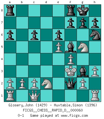 Last move : 0-1 2011 September 9 10:56:57 [Event "FICGS__CHESS__RAPID_D__000060"] [Site "FICGS"] [Date "2011.07.08"] [Round "1"] [White "Glosery,John"] [Black "Huxtable,Simon"] [Result "0-1"] [WhiteElo "1429"] [BlackElo "1396"] 1.e4 c6 2.f4 d5 3.e5 Bf5 4.d4 e6 5.Bd3 Nh6 6.Nf3 c5 7.h3 Be7 8.dxc5 Bh4+ 9.Ke2 Bg3 10.Bb5+ Nc6 11.Be3 a6 12.Ba4 O-O 13.Nbd2 d4 14.Bxc6 dxe3 15.Kxe3 bxc6 16.Qc1 Qd5 17.Ng5 Qxc5+ 18.Kf3 Qf2+ 0-1 Caro-Kann defense Kingside Castling by player Black (move 12) Player Black won this chess game. Follow this game move after move (download)Chess is 99 percent tactics. (Teichmann) Ich erzeugte keinen Neid, da mich die Schachspieler als Musiker und die Musiker als Schachspieler betrachteten. (Mark Taimanov) El Ajedrez hace al hombre ser mas sabio y ver mas claro. (Vladimir Putin) Tous ces prétendus hommes politiques sont les pions, les Cavaliers, les Tours ou les Fous d'une partie d'échecs qui se jouera tant qu'un hasard ne renversera pas l'échiquier. (Honoré de Balzac) Never was anything great achieved without danger. (Niccolo Machiavelli)