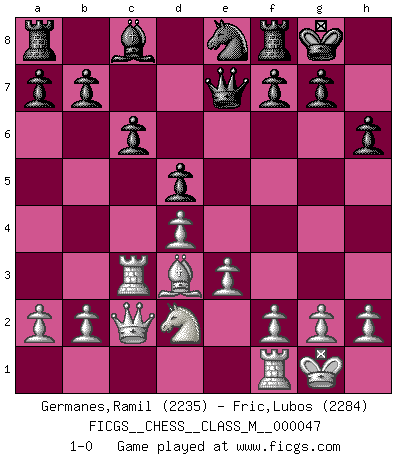 Last move : 1-0 2011 November 9 1:25:56 [Event "FICGS__CHESS__CLASS_M__000047"] [Site "FICGS"] [Date "2011.07.09"] [Round "1"] [White "Germanes,Ramil"] [Black "Fric,Lubos"] [Result "1-0"] [WhiteElo "2235"] [BlackElo "2284"] 1.d4 d5 2.c4 e6 3.Nc3 Nf6 4.Bg5 Be7 5.e3 O-O 6.Nf3 h6 7.Bh4 Ne4 8.Bxe7 Qxe7 9.Rc1 Nxc3 10.Rxc3 c6 11.Bd3 Nd7 12.cxd5 exd5 13.O-O Nf6 14.Nd2 Ne8 15.Qc2 1-0 This chess game has been lost on time (started : 2011.07.09 11:46:49) QGD : Lasker defense Kingside Castling by player Black (move 5) Kingside Castling by player White (move 13) Player White won this chess game. Follow this game move after move (download)I have never in my life played the French Defence, which is the dullest of all openings. (Wilhelm Steinitz) Gott hat gewollt, dass ich Champion werde. (Surab Azmajparaschvili) Aquellos que dicen entender al Ajedrez, no entienden nada. (Robert Hubner) L'action d'une oeuvre littéraire se déroule sur un champ de bataille. Les masques et les types du drame moderne correspondent aux pièces du jeu d'échecs. L'intrigue correspond aux coups et aux gambits, c'est à dire aux techniques du jeu telles qu'utilisées et interprétées par les joueurs. Les tactiques et les péripéties [mouvements] correspondent aux coups exécutés par l'adversaire. (Viktor Shklovsky) The real danger is not that computers will begin to think like men, but that men will begin to think like computers. (Sydney J. Harris)