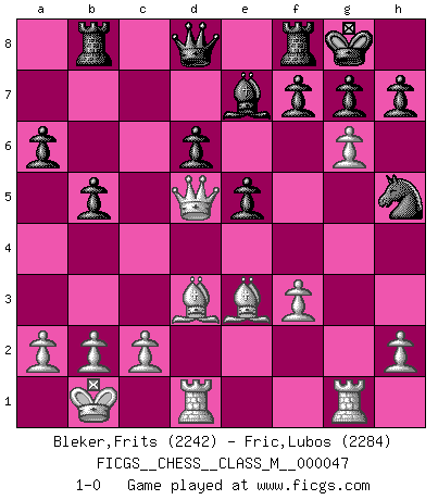 Last move : 1-0 2011 November 19 13:1:25 [Event "FICGS__CHESS__CLASS_M__000047"] [Site "FICGS"] [Date "2011.07.09"] [Round "1"] [White "Bleker,Frits"] [Black "Fric,Lubos"] [Result "1-0"] [WhiteElo "2242"] [BlackElo "2284"] 1.e4 c5 2.Nf3 d6 3.d4 cxd4 4.Nxd4 Nf6 5.Nc3 a6 6.Be3 e5 7.Nb3 Be6 8.f3 Be7 9.Qd2 O-O 10.O-O-O Nbd7 11.g4 Qc7 12.Kb1 b5 13.g5 Nh5 14.Nd5 Bxd5 15.exd5 Nb6 16.Na5 Nxd5 17.Qxd5 Qxa5 18.Bd3 Qd8 19.Rhg1 Rb8 20.g6 1-0 This chess game has been lost on time (started : 2011.07.09 11:46:49) Sicilian : Najdorf, Byrne (English) attack Kingside Castling by player Black (move 9) Queenside Castling by player White (move 10) Player White won this chess game. Follow this game move after move (download)Daring ideas are like Chess men moved forward. They may be beaten, but they may start a winning game. (Johann Wolfgang von Goethe) Der Traum, für den ich lebe, ist der von einem freien Russland. Viele mögen sagen: Russland hat doch ein Parlament, einen gewählten Präsidenten. Aber ich spüre, dass in meiner Heimat die Angst wiederkehrt. Eine Angst, sich frei zu äußern, bestimmte Dinge zu tun (Garry Kasparov) Los Peones son el alma de una partida de Ajedrez. (Francois Andre Danican Philidor) Plusieurs personnes se sont demandées comment Tal faisait pour gagner... En fait, c'est très simple ! Il met ses pièces au centre de l'échiquier et les sacrifie quelque part ! (David Bronstein) Vladimir Ras-Putin is still alive... He is also a good actor, I saw him in the Lord of the Rings. (Rodolfo d'Ettorre)