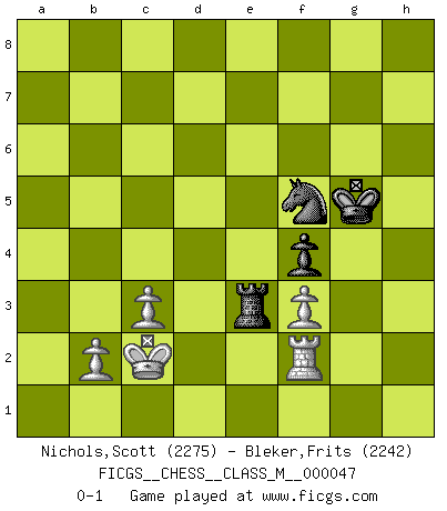 Last move : 0-1 2011 September 9 23:52:50 [Event "FICGS__CHESS__CLASS_M__000047"] [Site "FICGS"] [Date "2011.07.09"] [Round "1"] [White "Nichols,Scott"] [Black "Bleker,Frits"] [Result "0-1"] [WhiteElo "2275"] [BlackElo "2242"] 1.e4 c5 2.Nf3 d6 3.d4 cxd4 4.Nxd4 Nf6 5.Nc3 a6 6.f3 e5 7.Nb3 Be6 8.Be3 Nbd7 9.Qd2 Be7 10.g4 O-O 11.O-O-O b5 12.a3 Qc7 13.Kb1 Nb6 14.g5 Nh5 15.Na5 Rab8 16.Nd5 Bxd5 17.exd5 Nxd5 18.Qxd5 Qxa5 19.Bc4 Qc7 20.Ba2 Kh8 21.Rhf1 f5 22.Rd3 f4 23.Bf2 g6 24.h4 Rfc8 25.Rd2 Ng7 26.Qd3 Rf8 27.Rh1 a5 28.Bd5 Qd7 29.Qb3 Qc7 30.Rd3 Rfc8 31.Rd2 Rf8 32.Qd3 Qd7 33.Be4 b4 34.axb4 axb4 35.h5 gxh5 36.Qa6 b3 37.c3 Qb5 38.Qa7 Qe8 39.R2d1 Nf5 40.Rdg1 Qg6 41.Rh2 d5 42.Bd3 Bxg5 43.Rgh1 h6 44.Rxh5 Rbd8 45.Qb7 Rfe8 46.Rxg5 Qxg5 47.Bh4 Qg7 48.Qxg7+ Nxg7 49.Bxd8 Rxd8 50.Rxh6+ Kg8 51.Rf6 e4 52.Be2 Rf8 53.Rd6 Nf5 54.Rxd5 e3 55.Rb5 Ng3 56.Bc4+ Kg7 57.Rxb3 Re8 58.Rb7+ Kg6 59.Bd3+ Kf6 60.Rb6+ Kg5 61.Rg6+ Kh5 62.Rg7 e2 63.Bxe2 Nxe2 64.Rh7+ Kg6 65.Rh2 Re3 66.Kc2 Kf6 67.Rh6+ Kg5 68.Rh2 Ng3 69.Rf2 Nf5 0-1 Sicilian : Najdorf Kingside Castling by player Black (move 10) Queenside Castling by player White (move 11) 10 pieces endgame at move 63 : White KRBPPP , Black KRNP WHITE : King + 1 Rook 1 Bishop 3 Pawns BLACK : King + 1 Rook 1 Knight 1 Pawn 9 pieces endgame at move 63 : White KRPPP , Black KRNP WHITE : King + 1 Rook 3 Pawns BLACK : King + 1 Rook 1 Knight 1 Pawn Player Black won this chess game. Follow this game move after move (download)Good offense and good defense both begin with good development. (Bruce A. Moon) Das ganze Leben mit einer Ehefrau ist wie ein Endspiel mit ungleichfarbigen Läufern. (Viktor Kortschnoi) Un juego de Ajedrez es un dialogo, una conversación entre un jugador y su oponente. Cada movimiento del oponente puede contener amenazas o tropiezos, pero un jugador no se puede defender de las amenazas o tomar ventaja de los tropiezos si es que no se pregunta a sí mismo: ¿Que es lo que mi oponente va a hacer después de cada movida?. (Bruce A. Moon) Avant la finale, les dieux ont créé le milieu de partie. (Tarrasch) A good book on your shelf is a friend that turns its back on you and remains a friend. (Author unknown)