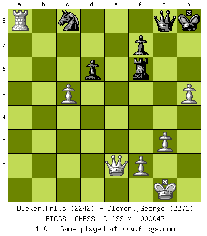 Last move : 1-0 2011 October 14 18:3:58 [Event "FICGS__CHESS__CLASS_M__000047"] [Site "FICGS"] [Date "2011.07.09"] [Round "1"] [White "Bleker,Frits"] [Black "Clement,George"] [Result "1-0"] [WhiteElo "2242"] [BlackElo "2276"] 1.e4 e5 2.Nf3 Nc6 3.Bb5 a6 4.Ba4 Nf6 5.O-O Be7 6.Re1 b5 7.Bb3 d6 8.c3 O-O 9.h3 Bb7 10.d4 Re8 11.Nbd2 Bf8 12.a3 h6 13.Bc2 Nb8 14.b3 Nbd7 15.Bb2 c6 16.Bd3 Nh5 17.g3 Nhf6 18.a4 Qc7 19.Qc2 Rac8 20.Bf1 Rcd8 21.axb5 axb5 22.c4 bxc4 23.bxc4 exd4 24.Nxd4 Ra8 25.Bg2 Nc5 26.Nf5 Nfd7 27.Nb3 Na4 28.Bxg7 Bxg7 29.Nxg7 Kxg7 30.Nd4 Ndc5 31.Nf5+ Kh8 32.Nxh6 Re6 33.Nf5 Bc8 34.Qd1 Rg6 35.Ra3 Kh7 36.h4 Be6 37.Qd2 Rb8 38.h5 Bxf5 39.exf5 Rh6 40.Qf4 Qd8 41.Bxc6 Nb6 42.Re8 Qc7 43.Rxb8 Qxb8 44.f6 Qd8 45.Be4+ Nxe4 46.Qxe4+ Kh8 47.Qe7 Qg8 48.c5 Nc8 49.Qe2 Rxf6 50.Ra8 1-0 Ruy Lopez : Closed Kingside Castling by player White (move 5) Kingside Castling by player Black (move 8) Player White won this chess game. Follow this game move after move (download)If a ruler does not understand Chess, how can he rule over a kingdom ? (King Khusros II) Ein Remis kann durch Wiederholung von drei Zügen oder durch einen schlechte Zug erreicht werden. (Savielly Grigorievitsch Tartakower) En la perfecta combinación de Ajedrez como en una historia corta de primera clase, toda la trama y contra trama deberá conducir hacia un final sorprendente, el interes no es mitigado hasta el último momento. (Yates and Winter) Les échecs c'est le défi de l'alpiniste, toujours plus haut, prêt à tout pour monter à l'assaut du Roi ennemi. Les échecs, c'est de la musique en mouvement, un ballet majestueux pour les yeux. C'est de la poésie composée par les fantômes du passé qui au même titre que Rimbaud ou Verlaine méritent notre admiration. Les échecs, c'est de la peinture ou le moindre mouvement modifie le tableau pour en faire un Picasso ou un Van Gogh. Les échecs, c'est tout et rien, c'est la vie et la mort. Jjulie33 sur le forum de France-Echecs. Hello Thibault, if I have had a plan (and I had one, I hope), I have forgotten it during the last week... - Hello Heinz-Georg. What do you mean a plan ? (Anonymous players, during a Big Chess game)