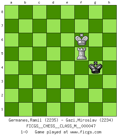 Last move : 1-0 2012 December 21 22:17:37 [Event "FICGS__CHESS__CLASS_M__000047"] [Site "FICGS"] [Date "2011.07.09"] [Round "1"] [White "Germanes,Ramil"] [Black "Gazi,Miroslav"] [Result "1-0"] [WhiteElo "2235"] [BlackElo "2234"] 1.Nf3 Nf6 2.c4 e6 3.Nc3 d5 4.d4 c6 5.Bg5 h6 6.Bh4 dxc4 7.e4 Qa5 8.Bxf6 gxf6 9.Bxc4 Nd7 10.O-O Bg7 11.a3 O-O 12.Qc2 Rd8 13.Rfe1 Nf8 14.Rad1 Bd7 15.Ba2 Rac8 16.e5 c5 17.d5 f5 18.h4 c4 19.Rd4 b5 20.g4 Qb6 21.Bb1 Rc5 22.Qd2 fxg4 23.Rxg4 exd5 24.Rg3 d4 25.Ne4 Rc6 26.h5 Kh8 27.Qf4 Bc8 28.Nd6 Rcxd6 29.exd6 Qxd6 30.Qxf7 Rd7 31.Qe8 Rd8 32.Qe7 Qxe7 33.Rxe7 Bf6 34.Rf7 Bg5 35.Bc2 d3 36.Nxg5 hxg5 37.Bd1 a5 38.Rxg5 b4 39.axb4 axb4 40.Rd5 Re8 41.Rd6 Bd7 42.Kg2 Rd8 43.Rxf8+ Rxf8 44.Rxd7 Rc8 45.Kf3 c3 46.bxc3 bxc3 47.Rxd3 c2 48.Bxc2 Rxc2 49.Rd7 Rc8 50.Kg4 Rg8+ 51.Kf5 Rf8+ 52.Kg6 Kg8 53.Rd2 Rc8 54.f4 Rc6+ 55.Kg5 Rc7 56.Rd8+ Kg7 57.f5 Rc1 58.Rd7+ Kf8 59.Kg6 Rg1+ 60.Kf6 Kg8 61.Rd8+ Kh7 62.Ke6 Re1+ 63.Kf7 Rf1 64.f6 Rh1 65.Ke7 Rxh5 66.f7 Rf5 67.f8Q Rxf8 68.Rxf8 Kg6 69.Ke6 Kg5 70.Rf5+ Kg4 71.Kf6 1-0 Reti Opening Kingside Castling by player White (move 10) Kingside Castling by player Black (move 11) 10 pieces endgame at move 46 : White KRBPPP , Black KRPP WHITE : King + 1 Rook 1 Bishop 3 Pawns BLACK : King + 1 Rook 2 Pawns 9 pieces endgame at move 46 : White KRBPP , Black KRPP WHITE : King + 1 Rook 1 Bishop 2 Pawns BLACK : King + 1 Rook 2 Pawns 8 pieces endgame at move 47 : White KRBPP , Black KRP WHITE : King + 1 Rook 1 Bishop 2 Pawns BLACK : King + 1 Rook 1 Pawn 7 pieces endgame at move 48 : White KRBPP , Black KR WHITE : King + 1 Rook 1 Bishop 2 Pawns BLACK : King + 1 Rook 6 pieces endgame at move 48 : White KRPP , Black KR WHITE : King + 1 Rook 2 Pawns BLACK : King + 1 Rook 5 pieces endgame at move 65 : White KRP , Black KR WHITE : King + 1 Rook 1 Pawn BLACK : King + 1 Rook Promotion Queen by player White (move 67) 4 pieces endgame at move 67 : White KR , Black KR WHITE : King + 1 Rook BLACK : King + 1 Rook 3 pieces endgame at move 68 : White KR , Black K WHITE : King + 1 Rook BLACK : King + Player White won this chess game. Follow this game move after move (download)Life is a kind of Chess, with struggle, competition, good and ill events. (Benjamin Franklin) Woher wissen wir, daß der Neanderthaler Blindschach gespielt hat? -- Bei Ausgrabungen wurden keine Schachbretter und Figuren gefunden. (Anonymous) Aquellos que dicen entender al Ajedrez, no entienden nada. (Robert Hubner) Les sacrifices démontrent seulement que quelqu'un a gaffé. (Savielly Tartacover) There's no money in correspondence chess. (John Knudsen)