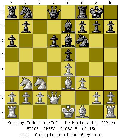 Last move : 0-1 2011 August 21 21:59:14 [Event "FICGS__CHESS__CLASS_B__000150"] [Site "FICGS"] [Date "2011.07.10"] [Round "1"] [White "Ponting,Andrew"] [Black "De Waele,Willy"] [Result "0-1"] [WhiteElo "1800"] [BlackElo "1973"] 1.e4 c5 2.Nf3 d6 3.d4 cxd4 4.Nxd4 Nf6 5.Nc3 a6 6.Be3 e5 7.Nb3 Be6 8.f3 Be7 9.Qd2 O-O 0-1 This chess game has been lost on time (started : 2011.07.10 12:41:44) Sicilian : Najdorf, Byrne (English) attack Kingside Castling by player Black (move 9) Player Black won this chess game. Follow this game move after move (download)You are for me the Queen on d8 and I am the Pawn on d7 !! (Eduard Gufeld) Kombinieren und Schwarzhandel gehören verboten. (Savielly Grigorievitsch Tartakower) El tablero es el mundo, las piezas es el fenomeno del universo, las reglas del juego son lo que llamamos leyes de la naturaleza y el jugador del lado opuesto, se encuentra oculto a nuestra vista. (Thomas Huxley) Si rien de grave n'est détecté lors de l'analyse d'une position, on joue alors le coup. Seconde règle de Blumenfeld. Convictions are more dangerous enemies of truth than lies. (Friedrich Nietzsche)
