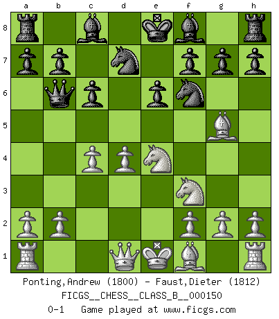 Last move : 0-1 2011 August 20 16:17:11 [Event "FICGS__CHESS__CLASS_B__000150"] [Site "FICGS"] [Date "2011.07.10"] [Round "1"] [White "Ponting,Andrew"] [Black "Faust,Dieter"] [Result "0-1"] [WhiteElo "1800"] [BlackElo "1812"] 1.d4 e6 2.c4 Nf6 3.Nc3 d5 4.Nf3 c6 5.Bg5 Nbd7 6.e4 dxe4 7.Nxe4 Qb6 0-1 Queen's pawn Player Black won this chess game. Follow this game move after move (download)Chess is the art which expresses the science of logic. (Mikhail Botvinnik) Ich spiele ehrlich und spiele, um zu gewinnen. Wenn ich verliere nehme ich meine Medizin. (Robert James Fischer) Los tropiezos estan todos ahí en el tablero, esperando que se cometan. (Savielly Tartakover) La menace est plus forte que l'exécution. (Aaron Nimzovitch) There is a computer disease that anybody who works with computers knows about. It's a very serious disease and it interferes completely with the work. The trouble with computers is that you 'play' with them ! (Richard P. Feynman)