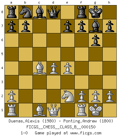 Last move : 1-0 2011 August 21 9:59:46 [Event "FICGS__CHESS__CLASS_B__000150"] [Site "FICGS"] [Date "2011.07.10"] [Round "1"] [White "Duenas,Alexis"] [Black "Ponting,Andrew"] [Result "1-0"] [WhiteElo "1980"] [BlackElo "1800"] 1.d4 Nf6 2.c4 g6 3.Nc3 d5 4.cxd5 Nxd5 5.e4 Nxc3 6.bxc3 Bg7 7.Bc4 c5 8.Ne2 cxd4 9.cxd4 O-O 10.O-O 1-0 This chess game has been lost on time (started : 2011.07.10 12:41:44) King's Indian defense, 3.Nc3 Kingside Castling by player Black (move 9) Kingside Castling by player White (move 10) Player White won this chess game. Follow this game move after move (download)If I win a tournament, I win it by myself. I do the playing. Nobody helps me. (Bobby Fischer) Wenn ich einen Club besuche, sind die Spieler stumm vor Staunen. (José Raúl Capablanca) En posiciones complicadas, Bobby Fischer pocas veces tuvo que temer de cualquiera. (Paul Keres) A ce moment-là, je menaçais de comprendre la position ! (Clément L'Heureux) Who needs drugs and alcohol if he can play Big Chess at FICGS ? (Heinz-Georg Lehnhoff)