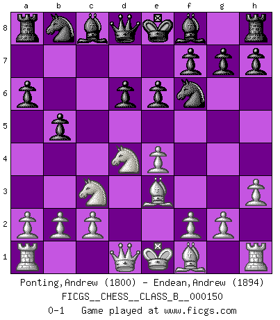 Last move : 0-1 2011 August 20 16:17:35 [Event "FICGS__CHESS__CLASS_B__000150"] [Site "FICGS"] [Date "2011.07.10"] [Round "1"] [White "Ponting,Andrew"] [Black "Endean,Andrew"] [Result "0-1"] [WhiteElo "1800"] [BlackElo "1894"] 1.e4 c5 2.Nf3 d6 3.d4 cxd4 4.Nxd4 Nf6 5.Nc3 a6 6.Be3 e6 7.h3 b5 0-1 Sicilian : Najdorf, Byrne (English) attack Player Black won this chess game. Follow this game move after move (download)Combinations have always been the most intriguing aspect of Chess. The masters look for them, the public applauds them, the critics praise them. It is because combinations are possible that Chess is more than a lifeless mathematical exercise. They are the poetry of the game; they are to Chess what melody is to music. They represent the triumph of mind over matter. (Reuben Fine) Schach ist wie eine schöne Frau, zu der wir ständig zurückkehren, gleichviel, wie oft sie uns zurückweist. (Anonymous) La partida mas dura de ganar es una partida ganada. (Emanuel Lasker) Les Echecs mettent en conflit, non pas deux intelligences, mais deux volontés. (Lasker) If we knew what we were doing, we would not call it research. (Albert Einstein)