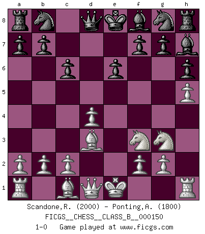 Last move : 1-0 2011 August 20 16:18:20 [Event "FICGS__CHESS__CLASS_B__000150"] [Site "FICGS"] [Date "2011.07.10"] [Round "1"] [White "Scandone,Raffaele"] [Black "Ponting,Andrew"] [Result "1-0"] [WhiteElo "2000"] [BlackElo "1800"] 1.e4 c6 2.d4 d5 3.Nc3 dxe4 4.Nxe4 Bf5 5.Ng3 Bg6 6.h4 h6 7.h5 Bh7 8.Nf3 e6 9.Bd3 1-0 Caro-Kann : Classical, 6.h4 Player White won this chess game. Follow this game move after move (download)No other master has such a terrific will to win. At the board he radiates danger, and even the strongest opponents tend to freeze, like rabbits when they smell a panther. Even his weaknesses are dangerous. As white, his opening game is predictable - you can make plans against it - but so strong that your plans almost never work. In the middle game his precision and invention are fabulous, and in the end game you simply cannot beat him. (Anonymous German Expert) Es genügt nicht ein guter Spieler zu sein, man muß auch gut spielen. (Siegbert Tarrasch) El Ajedrez tiene tanto misterio como las mujeres. (Purdy) Echiquier : carré parfait, comme la Jérusalem nouvelle décrite par l'auteur de l'Apocalypse, huit cases sur huit, exaltation du chiffre 4, symbole du cosmos aux quatre horizons... où le noir et le blanc, l'ombre et la lumière, le mal et le bien s'entremêlent et se conjuguent. (Robert Couffignal, Le Gambit du poète) . 'gn is not allowed in chess unless n is an integer between 1 and 8 inclusive, where 1 and 8 are to interpreted as the standard numerals standing for integers in the ordered real-closed field R, with the *canonical* ordering. (As opposed to, say, an integer in the domain Z[2+i*sqrt(5)] or an integer in some exotic Grothendieck topos). (Normajean Yates)