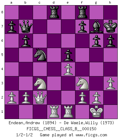 Last move : 1/2-1/2 2011 September 10 20:1:42 [Event "FICGS__CHESS__CLASS_B__000150"] [Site "FICGS"] [Date "2011.07.10"] [Round "1"] [White "Endean,Andrew"] [Black "De Waele,Willy"] [Result "1/2-1/2"] [WhiteElo "1894"] [BlackElo "1973"] 1.d4 d5 2.c4 c6 3.Nf3 Nf6 4.Nc3 e6 5.Bg5 h6 6.Bxf6 Qxf6 7.e3 Nd7 8.Bd3 dxc4 9.Bxc4 g6 10.O-O Bg7 11.Qc2 O-O 12.Ne4 Qe7 13.Bb3 e5 14.Nc3 Kh7 15.Rfe1 b6 16.Rad1 Bb7 17.d5 cxd5 18.Bxd5 Nc5 19.e4 Rad8 20.Bxb7 Qxb7 21.h3 1/2-1/2 QGD Slav : 4.Nc3 Kingside Castling by player White (move 10) Kingside Castling by player Black (move 11) This chess game ended in a draw. Follow this game move after move (download)If cunning alone were needed to excel, women would be the best Chess players. (Albin) Ohne Fehler kann es keine Brillanz geben. (Emanuel Lasker) Jugadores de primera clase pierden en contra de jugadores de segunda clase porque los jugadores de segunda clase a veces juegan una partida de primer clase. (Siegbert Tarrasch) Avant la finale, les dieux ont créé le milieu de partie. (Tarrasch) The worth of a book is to be measured by what you can carry away from it. (James Bryce)