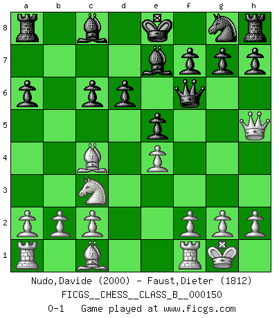 Last move : 0-1 2011 September 23 10:49:25 [Event "FICGS__CHESS__CLASS_B__000150"] [Site "FICGS"] [Date "2011.07.10"] [Round "1"] [White "Nudo,Davide"] [Black "Faust,Dieter"] [Result "0-1"] [WhiteElo "2000"] [BlackElo "1812"] 1.e4 c5 2.Nf3 d6 3.Nc3 Nc6 4.d4 cxd4 5.Nxd4 a6 6.Nxc6 bxc6 7.Bc4 e5 8.Qh5 Qf6 9.O-O Be7 0-1 This chess game has been lost on time (started : 2011.07.10 12:41:44) Sicilian Kingside Castling by player White (move 9) Player Black won this chess game. Follow this game move after move (download)Chess is no whit inferior to the violin, and we have a large number of professional violinists. (Mikhail Botvinnik) Schach verlangt totale Konzentration. (Robert James Fischer) Ayuda a tus piezas para que ellas te puedan ayudar. (Paul Morphy) Ne tendez aucun piège pour le plaisir ! Ne jouez rien dans l'espoir que l'adversaire réagisse de façon stupide ! Prenez toujours pour acquis que l'adversaire va trouver le meilleur coup ! Ne jouez jamais de coup dans l'espoir que l'adversaire ne voie pas la menace ! Chacun de vos coups doit améliorer la position d'une façon ou d'une autre. However beautiful the strategy, you should occasionally look at the results. (Winston Churchill)