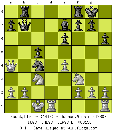 Last move : 0-1 2011 August 2 16:37:22 [Event "FICGS__CHESS__CLASS_B__000150"] [Site "FICGS"] [Date "2011.07.10"] [Round "1"] [White "Faust,Dieter"] [Black "Duenas,Alexis"] [Result "0-1"] [WhiteElo "1812"] [BlackElo "1980"] 1.d4 d5 2.c4 e6 3.Nc3 Nf6 4.Bg5 Be7 5.Nf3 h6 6.Bxf6 Bxf6 7.e3 O-O 8.Qd2 dxc4 9.Bxc4 c5 10.dxc5 Nd7 11.c6 bxc6 12.O-O-O Rb8 13.Bb3 Be7 14.Nd4 Qb6 15.Qc2 c5 16.Nf3 Qc7 17.Bc4 Nb6 18.Be2 Bd7 19.Bb5 Bxb5 20.Nxb5 Qb7 21.e4 Qa6 22.Nc3 Nc4 23.Qa4 Qb7 0-1 QGD : 4.Bg5 Be7 Kingside Castling by player Black (move 7) Queenside Castling by player White (move 12) Player Black won this chess game. Follow this game move after move (download)Chess is like life. (Boris Spassky) Privat ist Kortschnoi kein schlechter Mensch, sehr sympathisch. Aber während des Spiels ist er grausam. Er will dich töten. (Miguel Najdorf) Si tu oponente te ofrece un empate, trata de averiguar porque piensa él que esta en una posición peor. (Nigel Short) J'ai toujours senti une vague pitié pour l'homme qui ne connaît rien aux échecs, tout comme j'en aurais pour un homme ignorant de l'amour. Les Echecs, comme la musique ou comme l'amour, ont le pouvoir de rendre heureux. (Siegbert Tarrasch) As a goal marker shodan is important. As a destination it is a poor place to stop. (Thomas Tamayo)