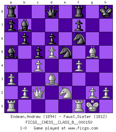 Last move : 1-0 2011 August 29 16:59:26 [Event "FICGS__CHESS__CLASS_B__000150"] [Site "FICGS"] [Date "2011.07.10"] [Round "1"] [White "Endean,Andrew"] [Black "Faust,Dieter"] [Result "1-0"] [WhiteElo "1894"] [BlackElo "1812"] 1.d4 e6 2.c4 Nf6 3.Nc3 b6 4.e4 Bb7 5.Bd3 Bb4 6.Qc2 c5 7.d5 exd5 8.exd5 O-O 9.Nge2 d6 10.O-O Nbd7 11.a3 Ba5 12.Bg5 h6 13.Bh4 Ne5 14.Ne4 g5 15.Nxg5 hxg5 16.Bxg5 Kh8 17.f4 1-0 Queen's pawn Kingside Castling by player Black (move 8) Kingside Castling by player White (move 10) Player White won this chess game. Follow this game move after move (download)By this measure (on the gap between Fischer & his contemporaries), I consider him the greatest world champion. (Garry Kasparov) Spielt Blackmar-Diemer-Gambit, und das Matt kommt von selbst! (Emil Joseph Diemer) No solamente yo pronostico su triunfo sobre Botvinnik, sino que me adelanto y digo que probablemente Fischer es el jugador de Ajedrez mas grande que haya existido. (John Collins) Toute estimation doit être constamment réévaluée. (Jacob Estrin) You think that education is too expensive ? Try ignorance. (Derek Bok)