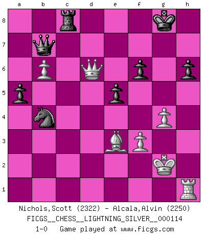 Last move : 1-0 2011 July 10 19:56:21 [Event "FICGS__CHESS__LIGHTNING_SILVER__000114"] [Site "FICGS"] [Date "2011.07.10"] [Round "1"] [White "Nichols,Scott"] [Black "Alcala,Alvin"] [Result "1-0"] [WhiteElo "2322"] [BlackElo "2250"] 1.e4 c5 2.Nf3 d6 3.d4 cxd4 4.Nxd4 Nf6 5.Nc3 a6 6.f3 e5 7.Nb3 Be6 8.Be3 h5 9.Qd2 Nbd7 10.a4 Be7 11.Be2 Rc8 12.O-O h4 13.a5 O-O 14.Rfd1 Qc7 15.Bf1 Rfe8 16.Qf2 Qb8 17.Rd2 Red8 18.Ba7 Qa8 19.Nc1 Nc5 20.Bb6 Rf8 21.Nd3 Ncd7 22.Be3 Rc4 23.Nc1 Rc7 24.N1a2 Qe8 25.R2d1 Qc8 26.Nb4 Re8 27.Qd2 Bd8 28.Na4 Be7 29.Rac1 Bc4 30.Bxc4 Rxc4 31.c3 Qb8 32.b3 R4c8 33.Nb6 Nxb6 34.axb6 h3 35.g3 Nd7 36.c4 Nc5 37.Rb1 Rf8 38.Nd5 Bd8 39.b4 Nd7 40.Rbc1 Re8 41.c5 Rc6 42.Qf2 dxc5 43.bxc5 Qc8 44.Qf1 Nb8 45.g4 Be7 46.Nxe7+ Rxe7 47.Qxh3 Qe8 48.Qg2 Rd7 49.Rd5 Rc8 50.Qd2 R7d8 51.h4 Nc6 52.h5 f6 53.Rd1 Qf7 54.Kg2 a5 55.h6 gxh6 56.Rh1 Rxd5 57.exd5 Nb4 58.c6 Qxd5 59.cxb7 Qxb7 60.Qd6 1-0 Sicilian : Najdorf Kingside Castling by player White (move 12) Kingside Castling by player Black (move 13) Player White won this chess game. Follow this game move after move (download)Let the perfectionist play postal. (Yasser Seirawan) Ohne ihre Erfolge schmälern zu wollen würde ich sagen Petrosian, Spassky und Karpov verdanken ihre Siege ihren Trainern - Boleslavsky, Bondarevsky und Furman. (Mikhail Moiseyevich Botvinik) El ganador de una partida es aquel jugador que hace el penúltimo error. (Savielly Tartakover) L'action d'une oeuvre littéraire se déroule sur un champ de bataille. Les masques et les types du drame moderne correspondent aux pièces du jeu d'échecs. L'intrigue correspond aux coups et aux gambits, c'est à dire aux techniques du jeu telles qu'utilisées et interprétées par les joueurs. Les tactiques et les péripéties [mouvements] correspondent aux coups exécutés par l'adversaire. (Viktor Shklovsky) Unless in communicating with it one says exactly what one means, trouble is bound to result. (Alan Turing, about computers)