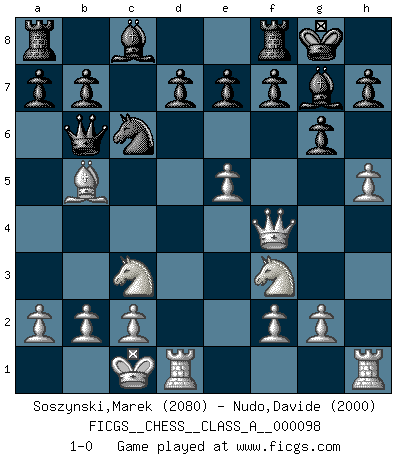 Last move : 1-0 2011 November 2 12:23:32 [Event "FICGS__CHESS__CLASS_A__000098"] [Site "FICGS"] [Date "2011.07.12"] [Round "1"] [White "Soszynski,Marek"] [Black "Nudo,Davide"] [Result "1-0"] [WhiteElo "2080"] [BlackElo "2000"] 1.e4 c5 2.d4 cxd4 3.Qxd4 Nc6 4.Qa4 g6 5.Bb5 Nf6 6.Nf3 Bg7 7.Nc3 O-O 8.e5 Ne8 9.Bf4 Nc7 10.O-O-O Ne6 11.h4 Nxf4 12.Qxf4 Qb6 13.h5 1-0 This chess game has been lost on time (started : 2011.07.12 17:45:12) Sicilian : Smith-Morra gambit Kingside Castling by player Black (move 7) Queenside Castling by player White (move 10) Player White won this chess game. Follow this game move after move (download)Chess, like any creative activity, can exist only through the combined efforts of those who have creative talent, and those who have the ability to organize their creative work. (Mikhail Botvinnik) Bis jetzt ist Weiß einer wohlbekannten Analyse gefolgt. Aber jetzt begeht er einen schrecklichen Fehler: Er beginnt seinen eigenen Kopf zu benutzen. (Siegbert Tarrasch) Tu eres para mi la Reina en d8 y yo soy el Peón en d7!!. (GM Eduard Gufeld) L'attaque fait le spectacle, la défense gagne les matchs. (Dicton footballistique) When a man with money meets a man with experience, the man with experience leaves with money and the man with money leaves with experience. (Anonymous)