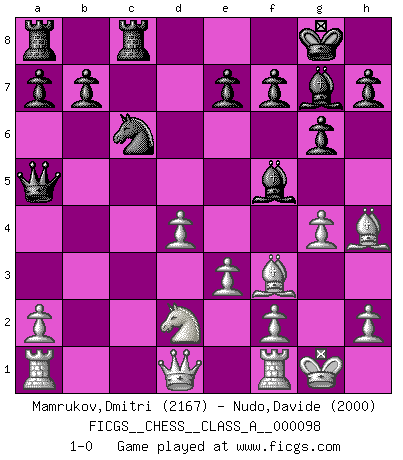 Last move : 1-0 2011 November 4 0:32:8 [Event "FICGS__CHESS__CLASS_A__000098"] [Site "FICGS"] [Date "2011.07.12"] [Round "1"] [White "Mamrukov,Dmitri"] [Black "Nudo,Davide"] [Result "1-0"] [WhiteElo "2167"] [BlackElo "2000"] 1.d4 Nf6 2.c4 g6 3.Nc3 d5 4.Nf3 Bg7 5.Bg5 Ne4 6.Bh4 c5 7.cxd5 Nxc3 8.bxc3 Qxd5 9.e3 cxd4 10.cxd4 Nc6 11.Be2 O-O 12.O-O Bf5 13.Nd2 Rfc8 14.Bf3 Qa5 15.g4 1-0 This chess game has been lost on time (started : 2011.07.12 17:45:12) King's Indian defense, 3.Nc3 Kingside Castling by player Black (move 11) Kingside Castling by player White (move 12) Player White won this chess game. Follow this game move after move (download)The King is a fighting piece. Use it ! (Wilhelm Steinitz) Schach ist die gewalttätigste aller Sportarten. (Garry Kasparov) La estratégia requiere pensar, la táctica requiere observación. (Max Euwe) Seul un grand joueur sait à quel point il joue faiblement. (Xavier Tartacover) A belief is an idea the mind possesses, an idea that possesses the mind. (Robert Oxden Bolton)