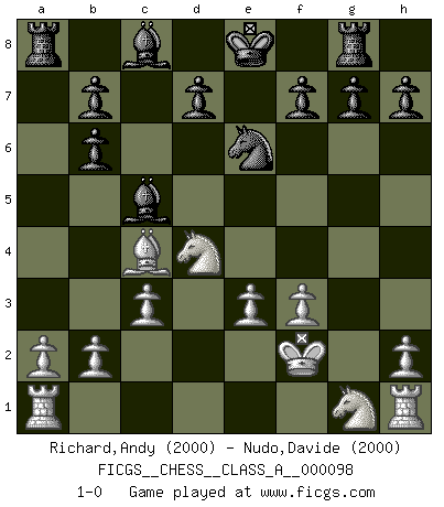 Last move : 1-0 2011 November 3 12:29:48 [Event "FICGS__CHESS__CLASS_A__000098"] [Site "FICGS"] [Date "2011.07.12"] [Round "1"] [White "Richard,Andy"] [Black "Nudo,Davide"] [Result "1-0"] [WhiteElo "2000"] [BlackElo "2000"] 1.d4 Nf6 2.Bg5 Ne4 3.Bf4 c5 4.f3 Qa5+ 5.c3 Nf6 6.Nd2 cxd4 7.Nb3 Qb6 8.Qxd4 Nc6 9.Qxb6 axb6 10.Nd4 e5 11.Nxc6 exf4 12.Nd4 Rg8 13.g3 Bc5 14.gxf4 Nd5 15.Kf2 Nxf4 16.e3 Ne6 17.Bc4 1-0 This chess game has been lost on time (started : 2011.07.12 17:45:12) Trompowsky attack (Ruth, Opovcensky Opening) Player White won this chess game. Follow this game move after move (download)Chess is a fighting game which is purely intellectual and includes chance. (Richard Reti) Alles was ich jemals tun will ist Schach spielen. (Robert James Fischer) Por esta medida (el intervalo entre Fischer y sus contemporaneos), yo le considero el mas grande campeón mundial. (Garry Kasparov) Le système Elo représente seulement une moyenne. Il est simplement un indicateur de votre stabilité. (Anatoli Karpov) The general who wins the battle makes many calculations in his temple before the battle is fought. The general who loses makes but few calculations beforehand. (Sun Tzu)